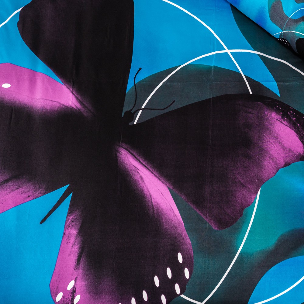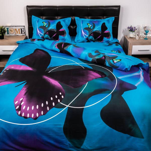 Lenjerie pat dublu, Ralex Pucioasa, Bumbac Satinat, 4 piese, 3D Digital Print, Albastru-Negru, fluturi, cod produs: RXE76