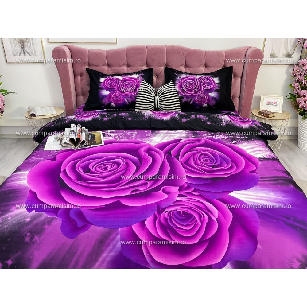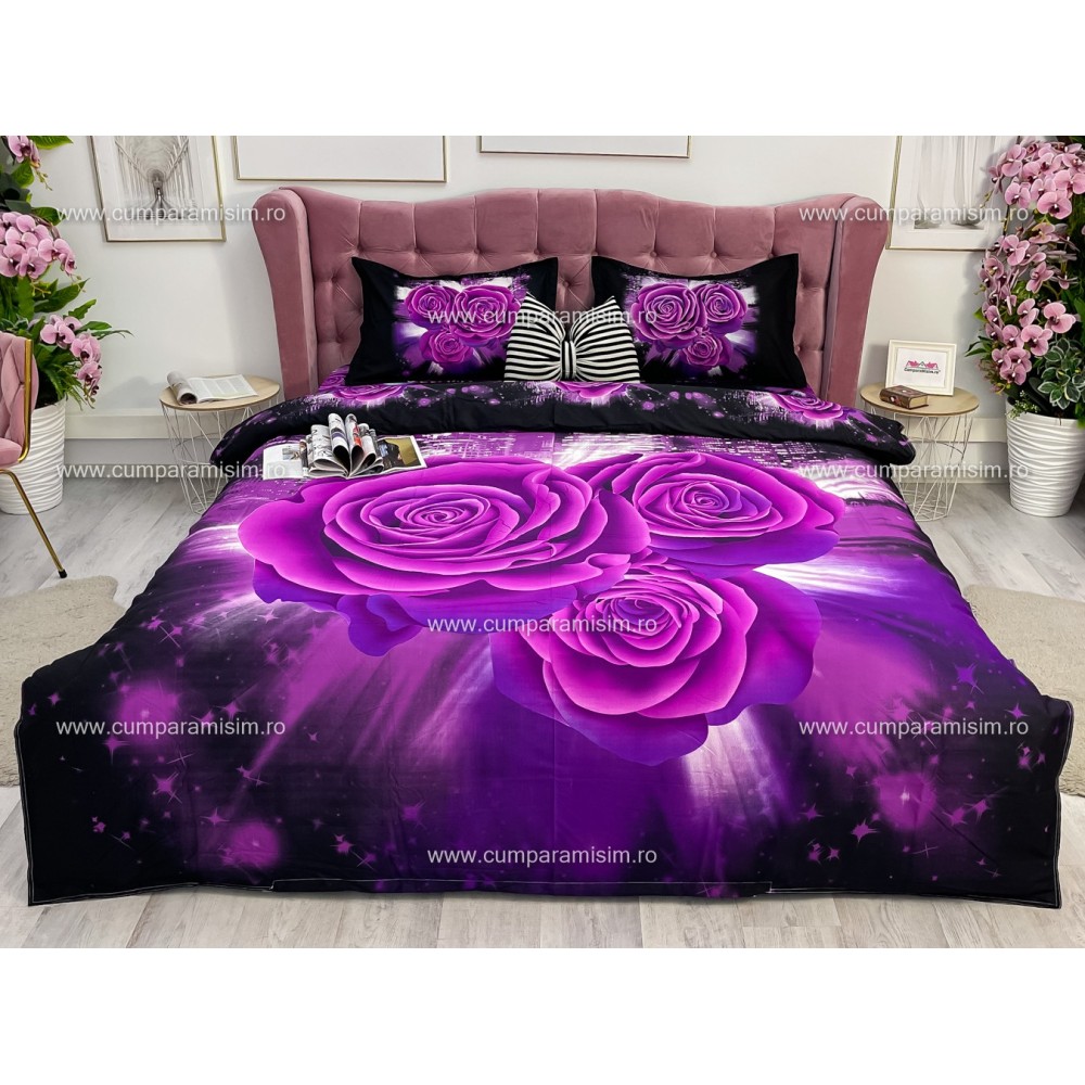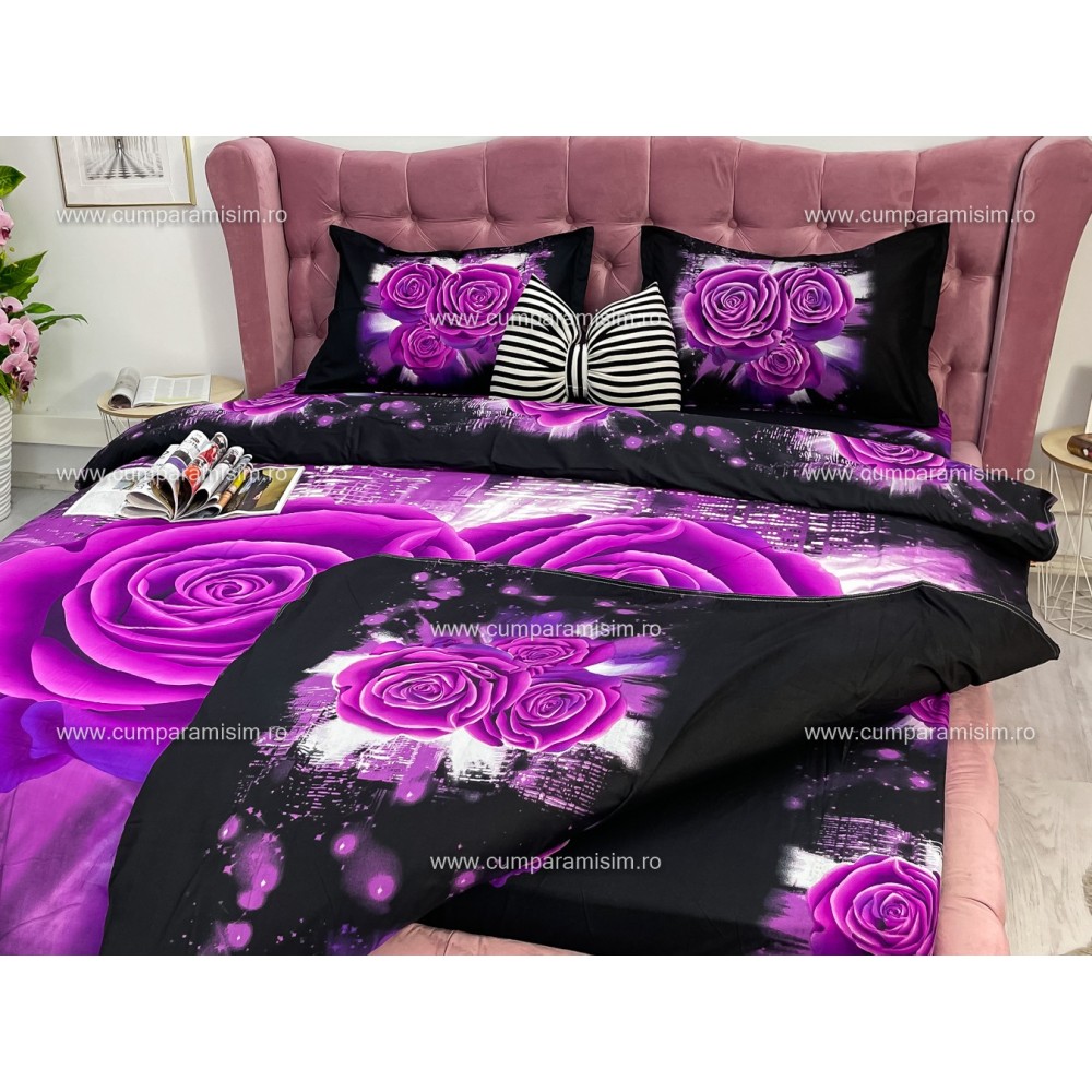 Lenjerie pat dublu, Ralex Pucioasa, Bumbac Satinat, 4 piese, 3D Digital Print, Negru-Mov, trandafiri, cod produs: RXE77
