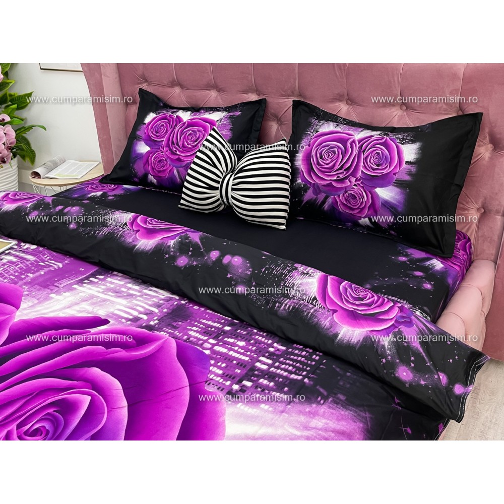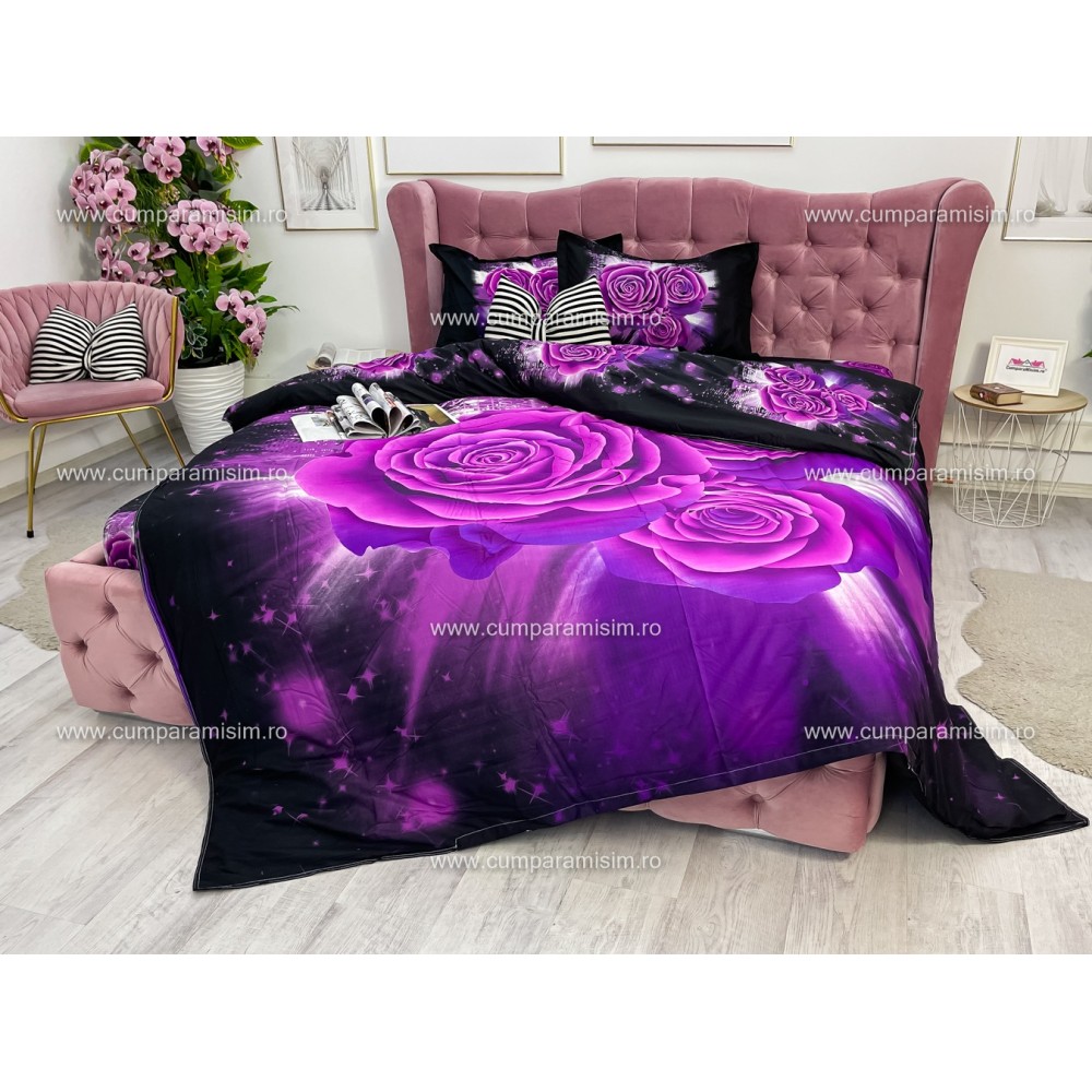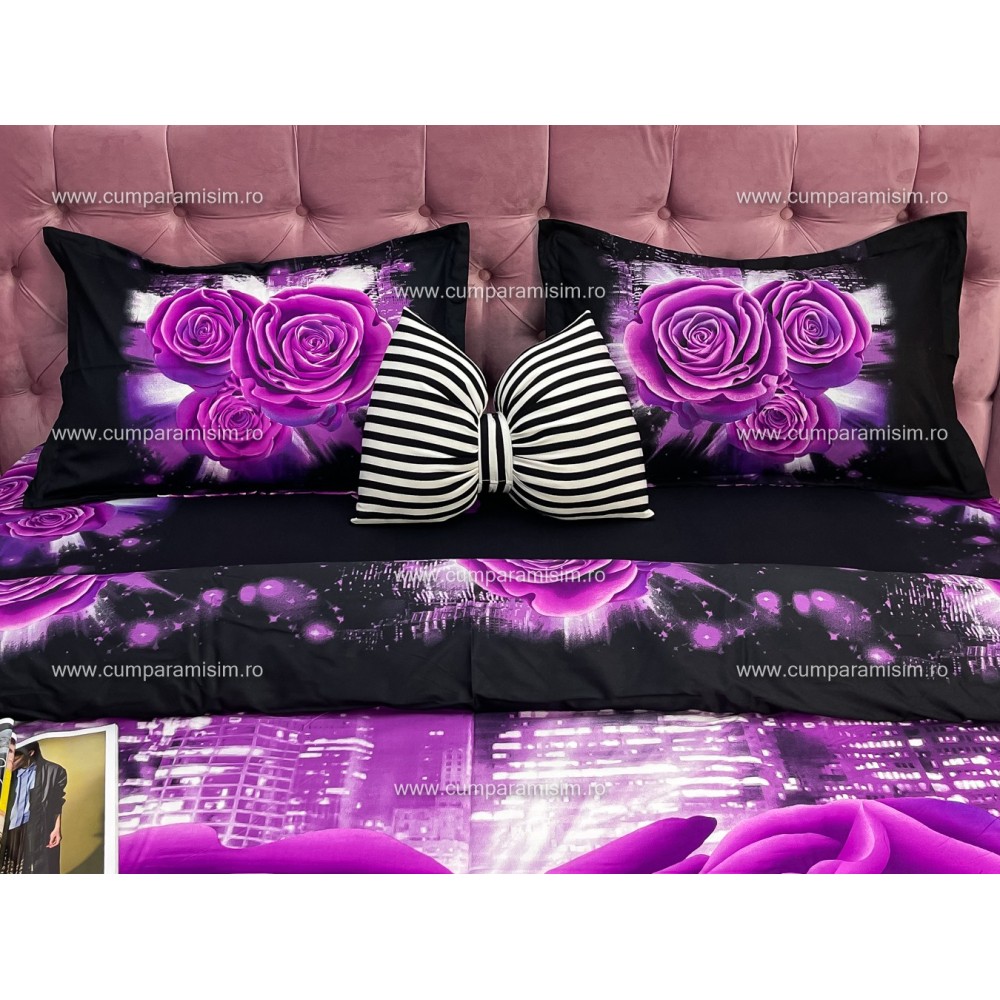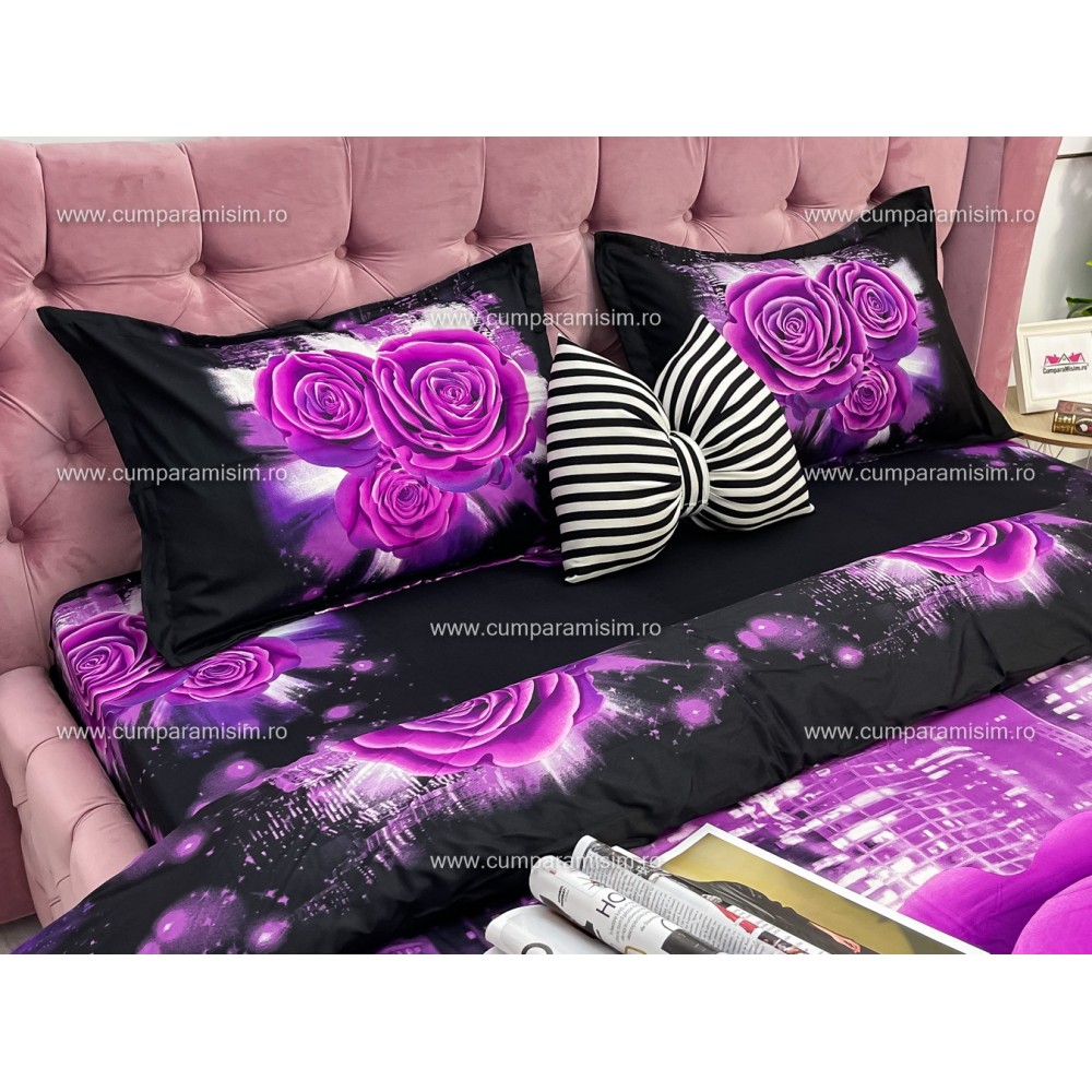 Lenjerie pat dublu, Ralex Pucioasa, Bumbac Satinat, 4 piese, 3D Digital Print, Negru-Mov, trandafiri, cod produs: RXE77