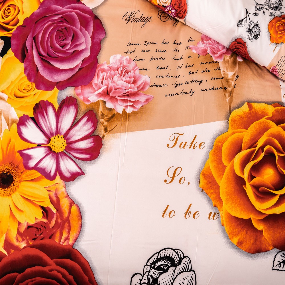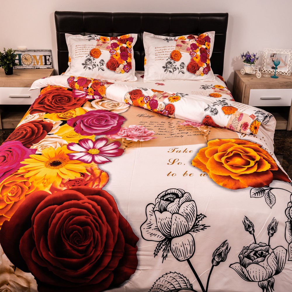 Lenjerie pat dublu, Ralex Pucioasa, Bumbac Satinat, 4 piese, 3D Digital Print, Alb-Multicolor, flori, cod produs: RXE83
