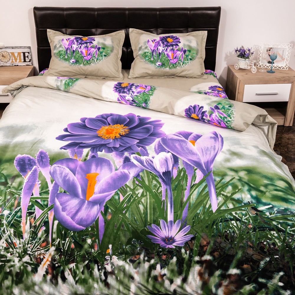Lenjerie pat dublu, Ralex Pucioasa, Bumbac Satinat, 4 piese, 3D Digital Print, Bej-Mov, flori , cod produs: RXE85