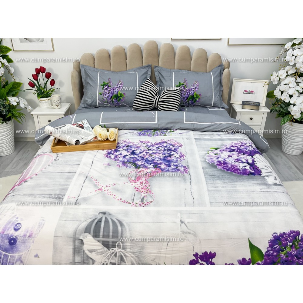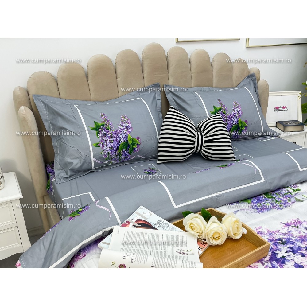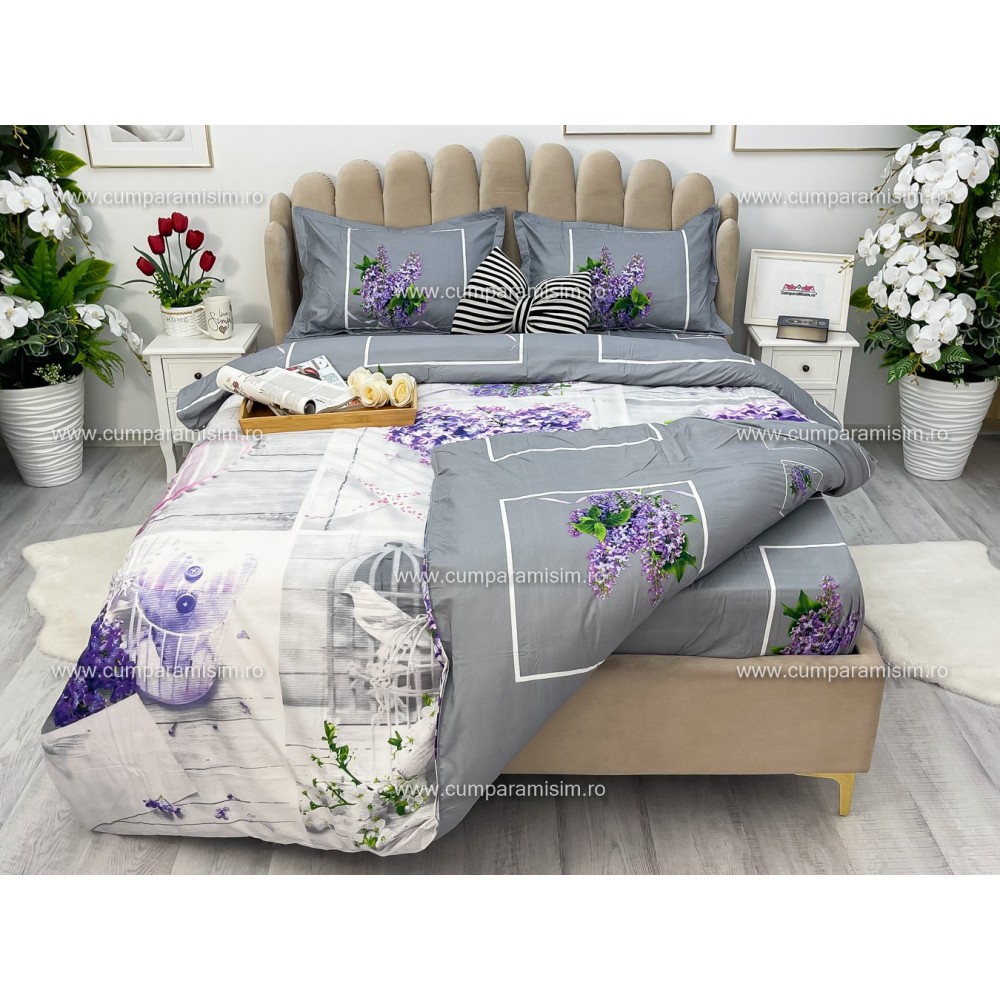 Lenjerie pat dublu, Ralex Pucioasa, Bumbac Satinat, 4 piese, 3D Digital Print, Gri-Mov, liliac, cod produs: RXE88