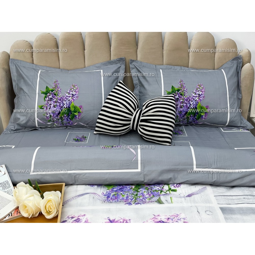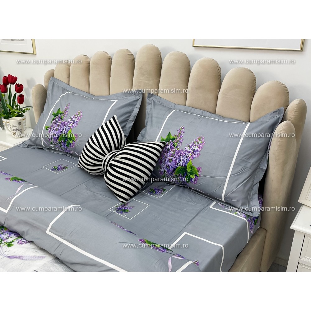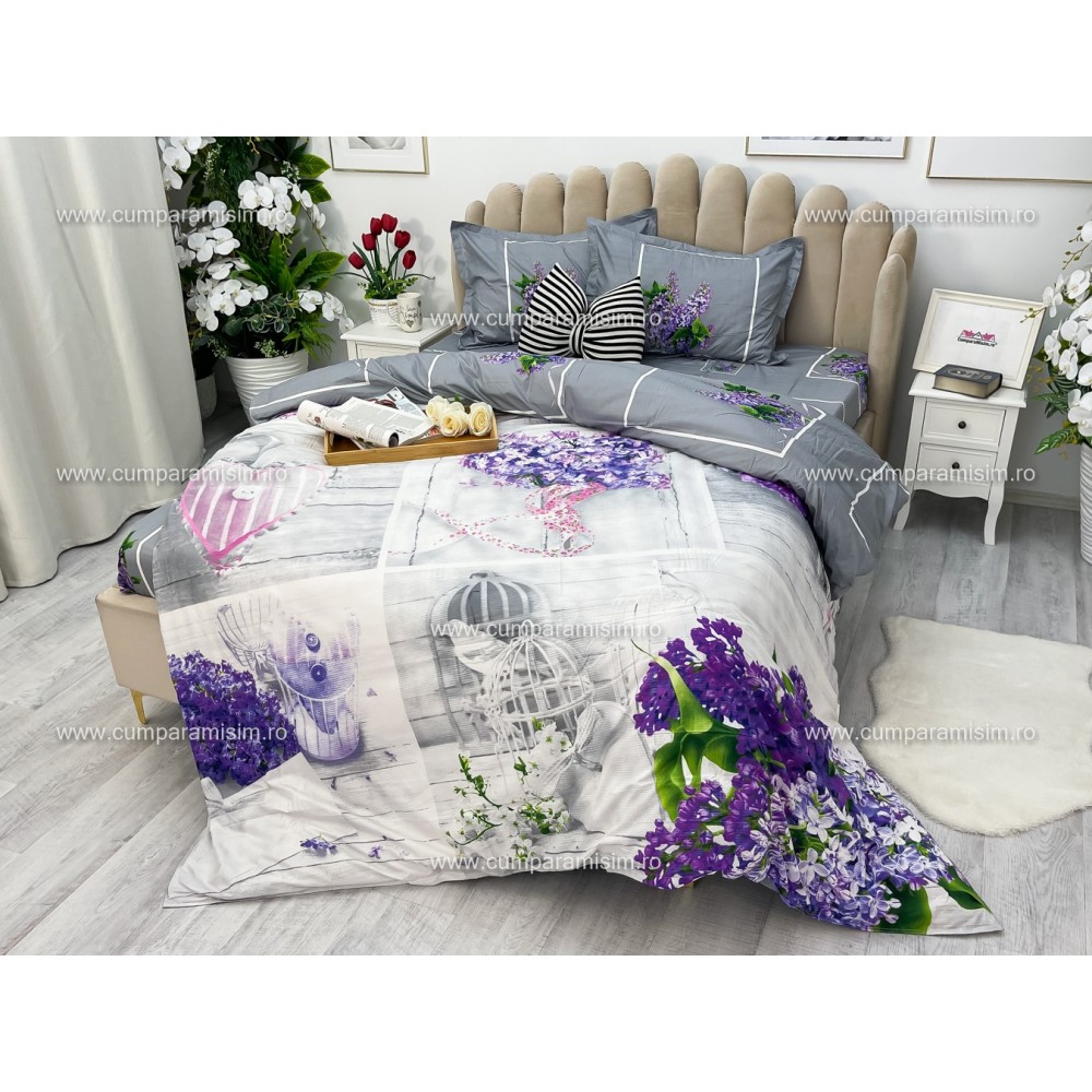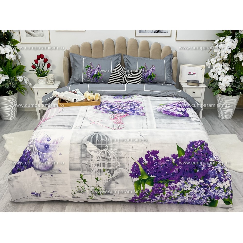 Lenjerie pat dublu, Ralex Pucioasa, Bumbac Satinat, 4 piese, 3D Digital Print, Gri-Mov, liliac, cod produs: RXE88