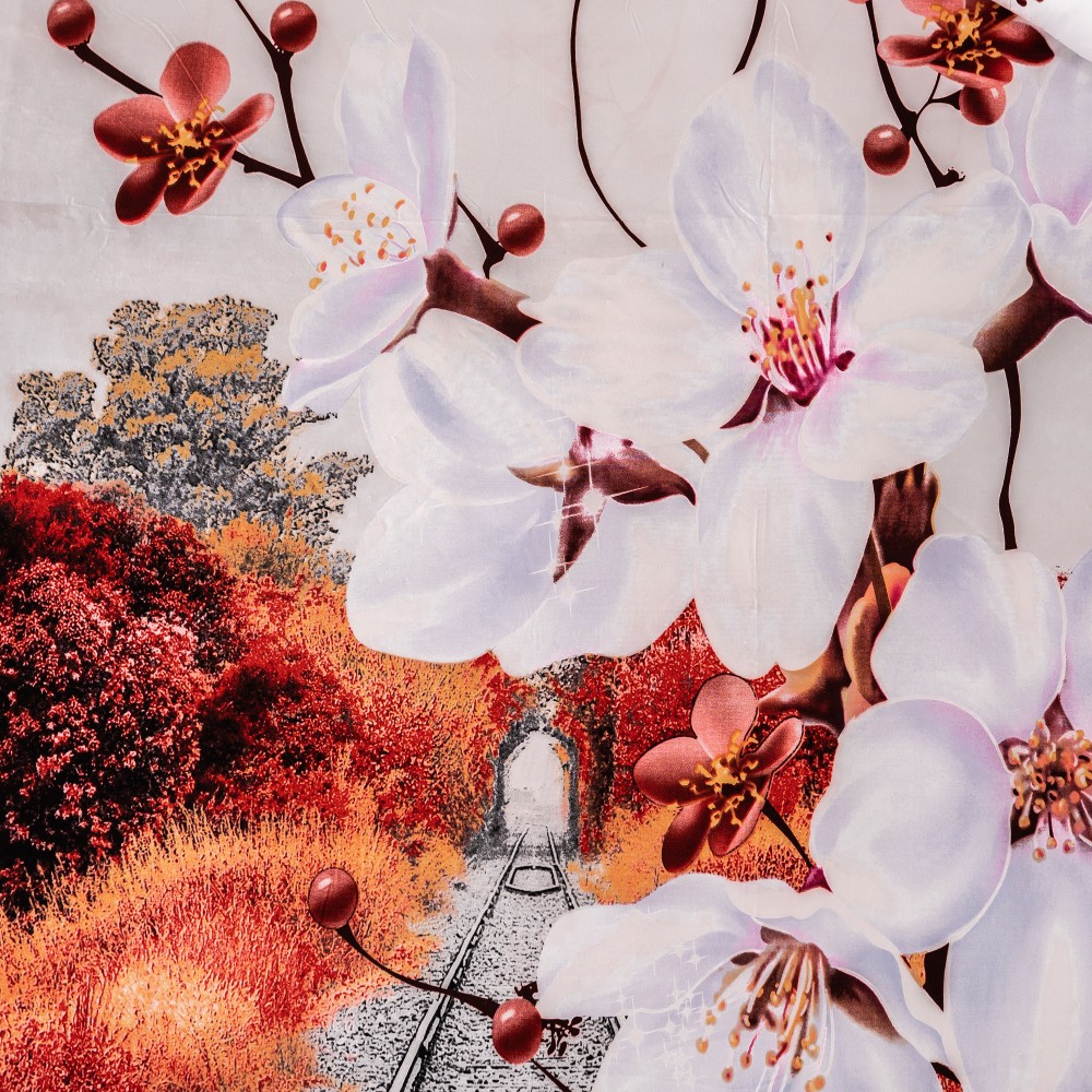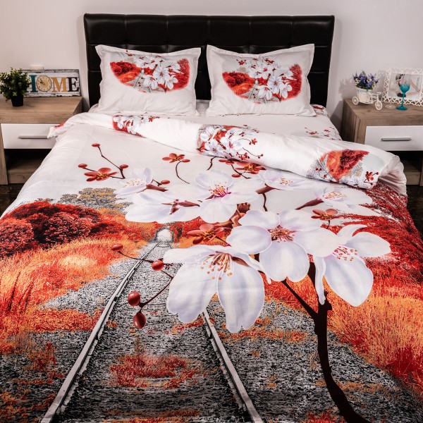 Lenjerie pat dublu, Ralex Pucioasa, Bumbac Satinat, 4 piese, 3D Digital Print, Alb-Rosu, peisaj, cod produs: RXE100