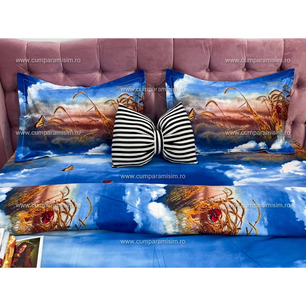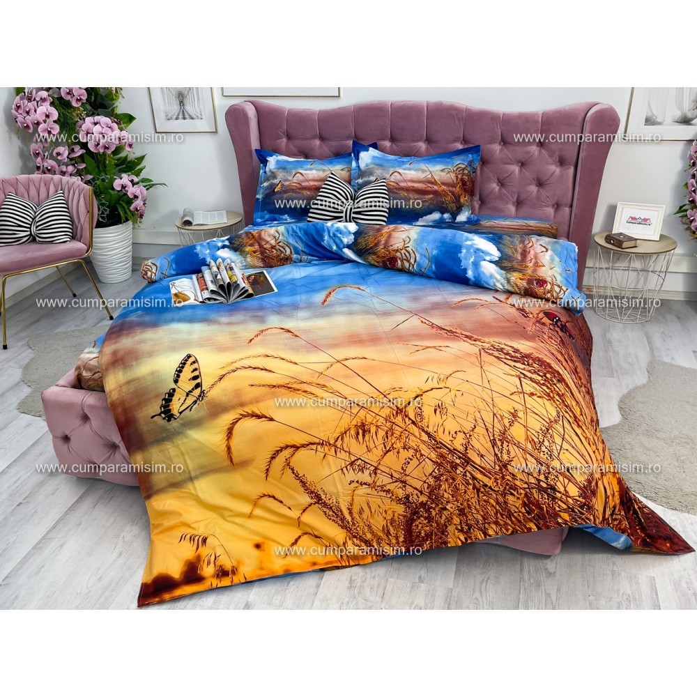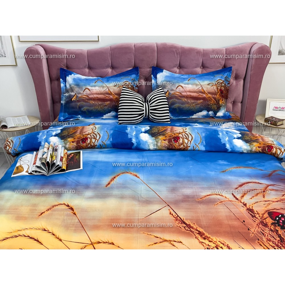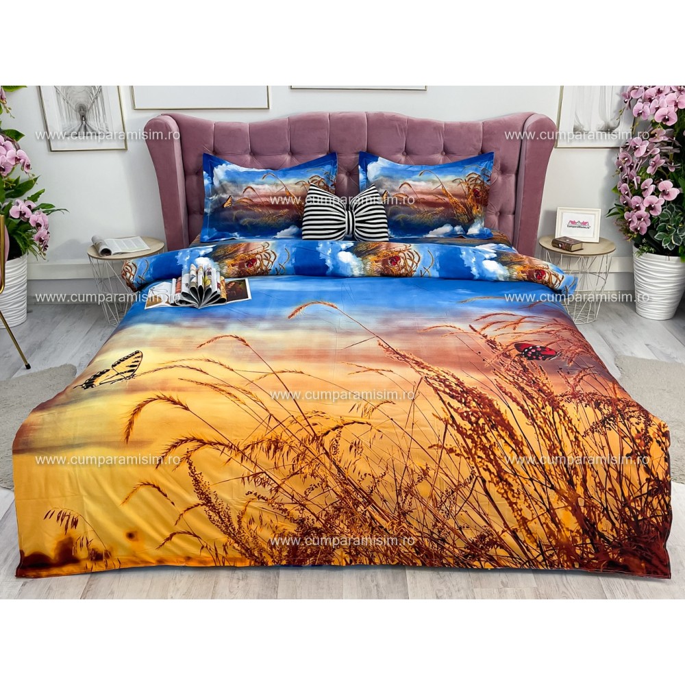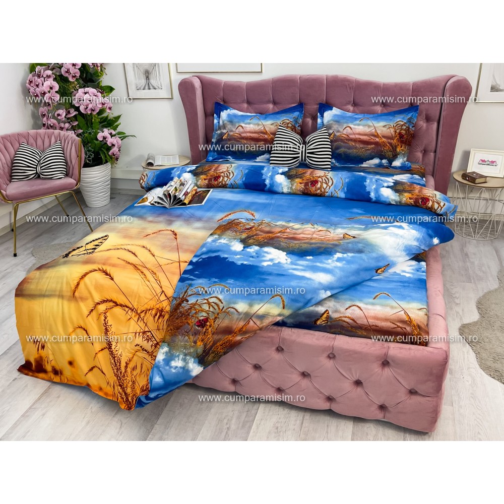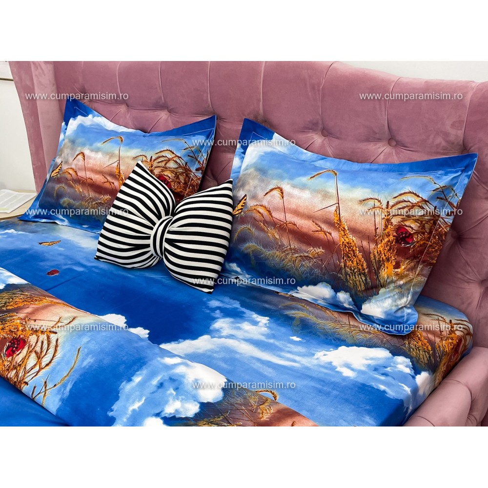 Lenjerie pat dublu, Ralex Pucioasa, Bumbac Satinat, 4 piese, 3D Digital Print, Galben-Albastru, peisaj, cod produs: RXE105