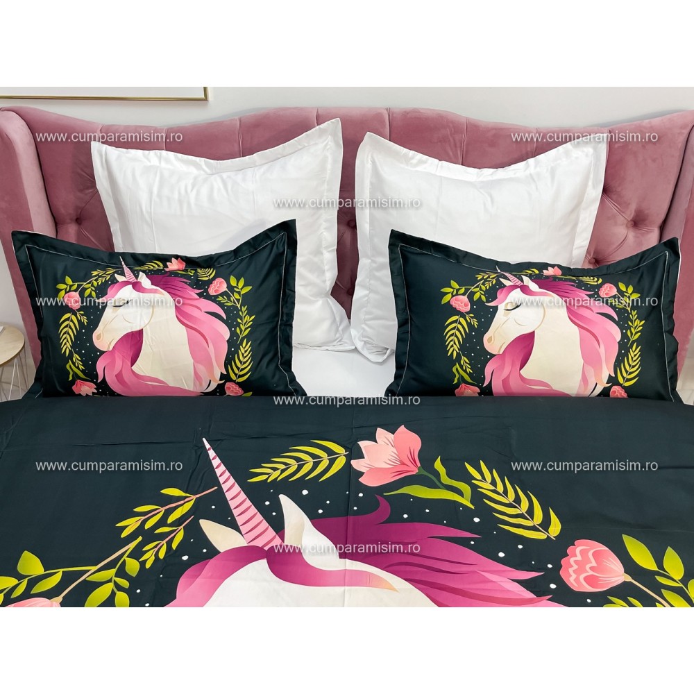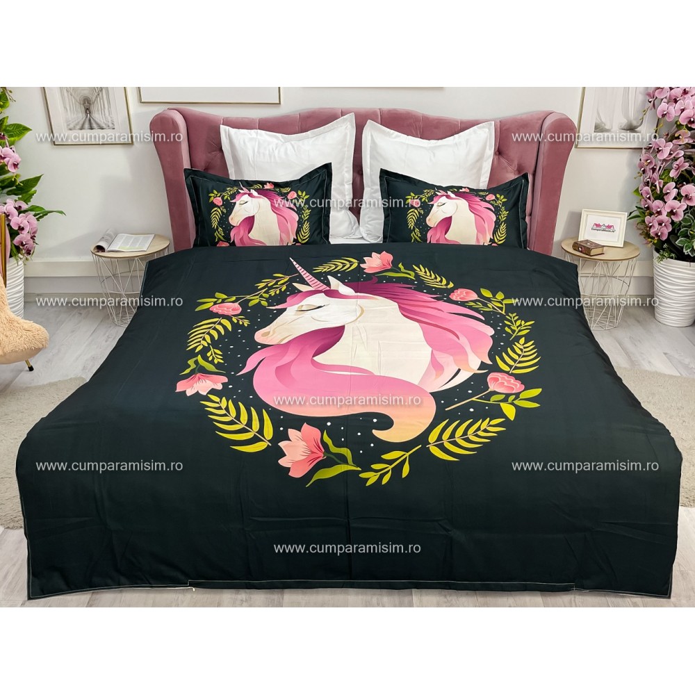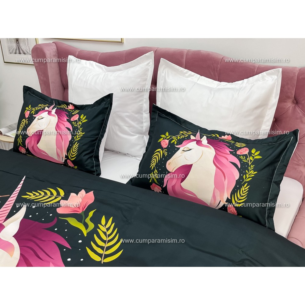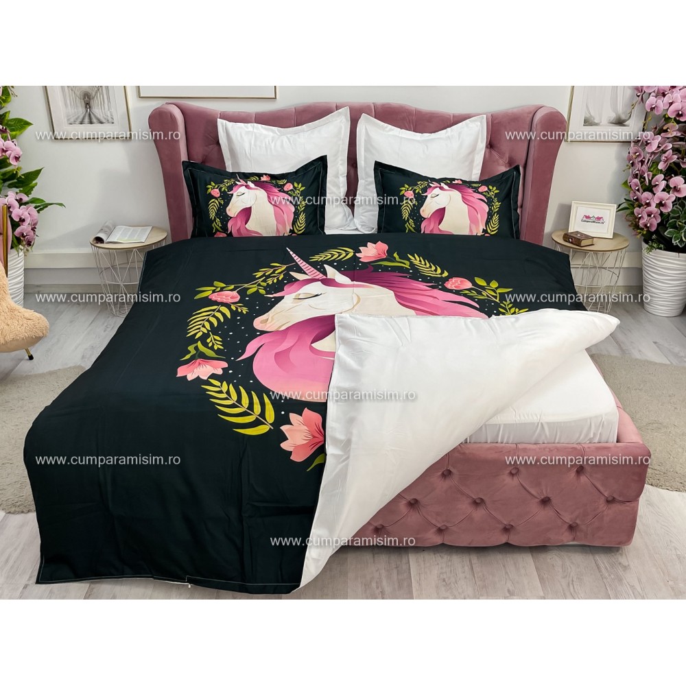 Lenjerie pat dublu, Ralex Pucioasa, 6 piese, Bumbac Finet, imprimeu 3D, IDENTIC CU POZA, Gri, unicorn, cod produs: RXF305