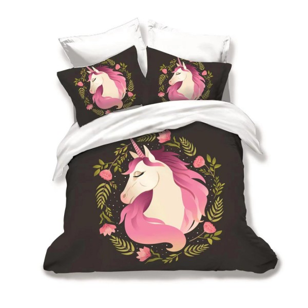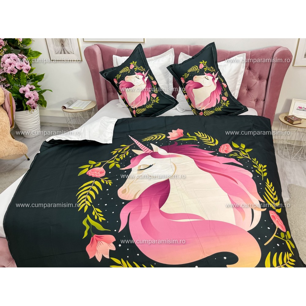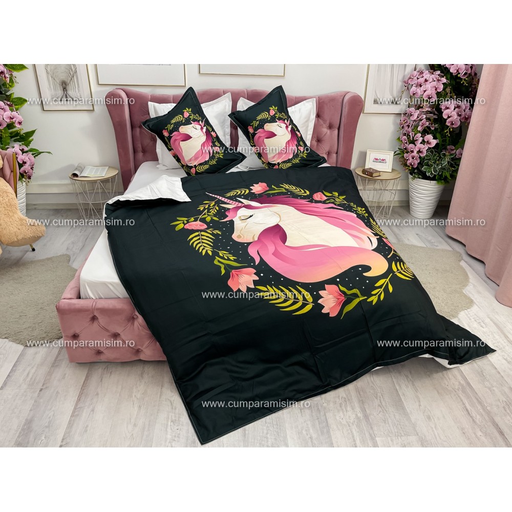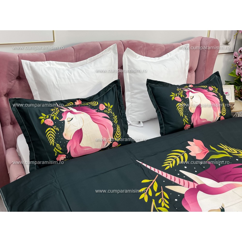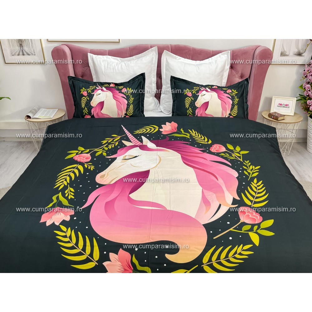 Lenjerie pat dublu, Ralex Pucioasa, 6 piese, Bumbac Finet, imprimeu 3D, IDENTIC CU POZA, Gri, unicorn, cod produs: RXF305