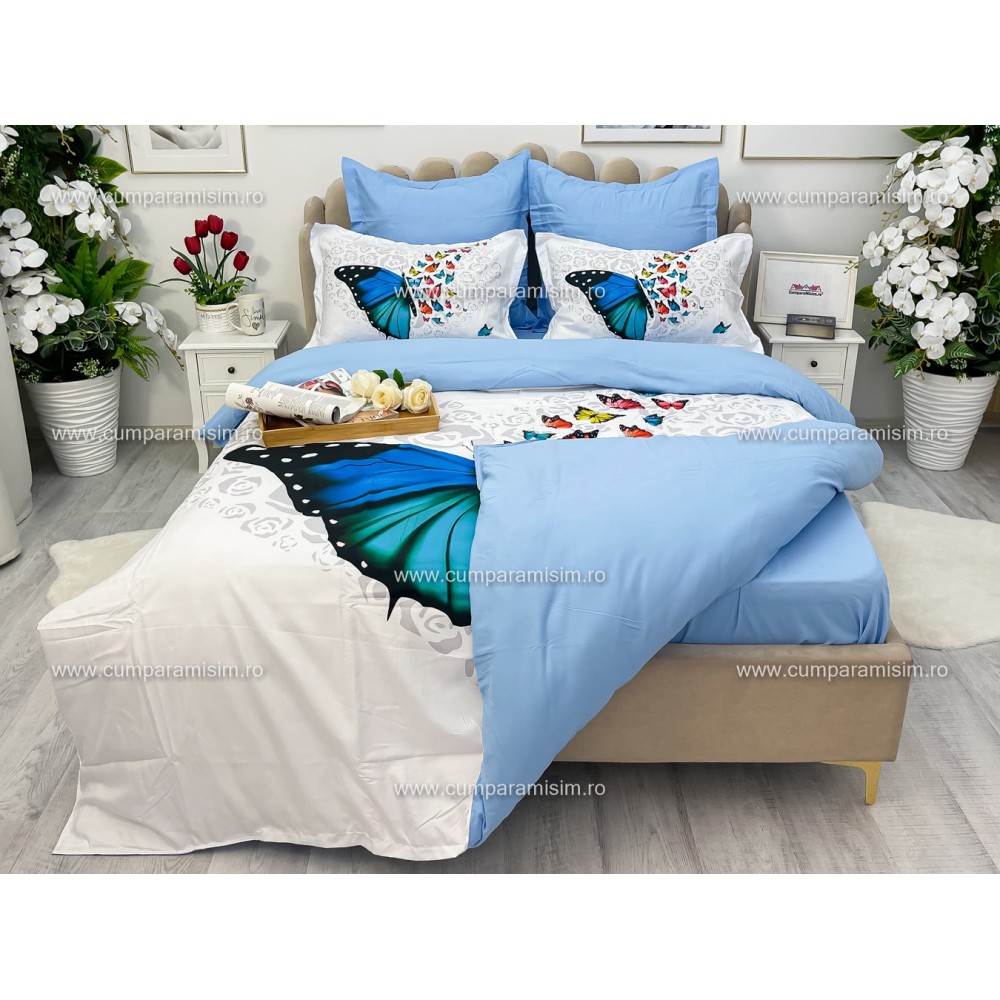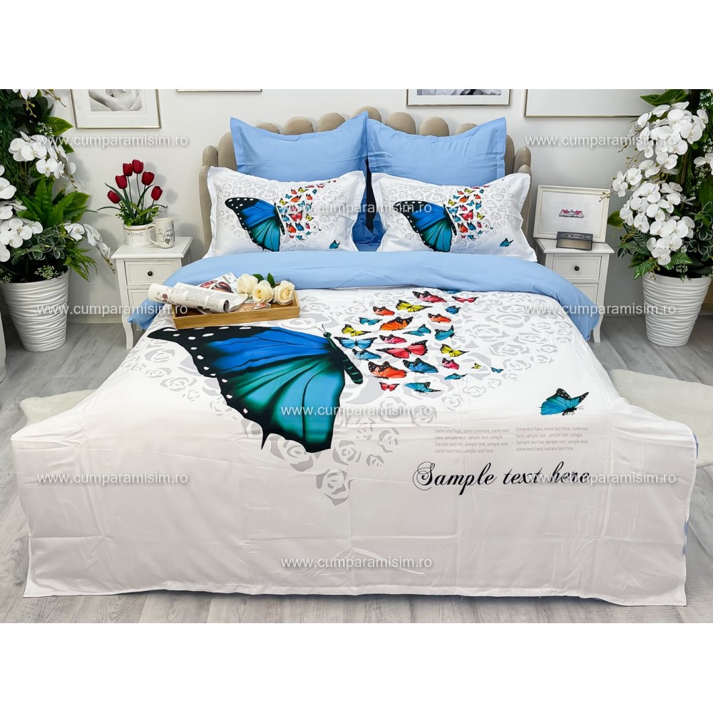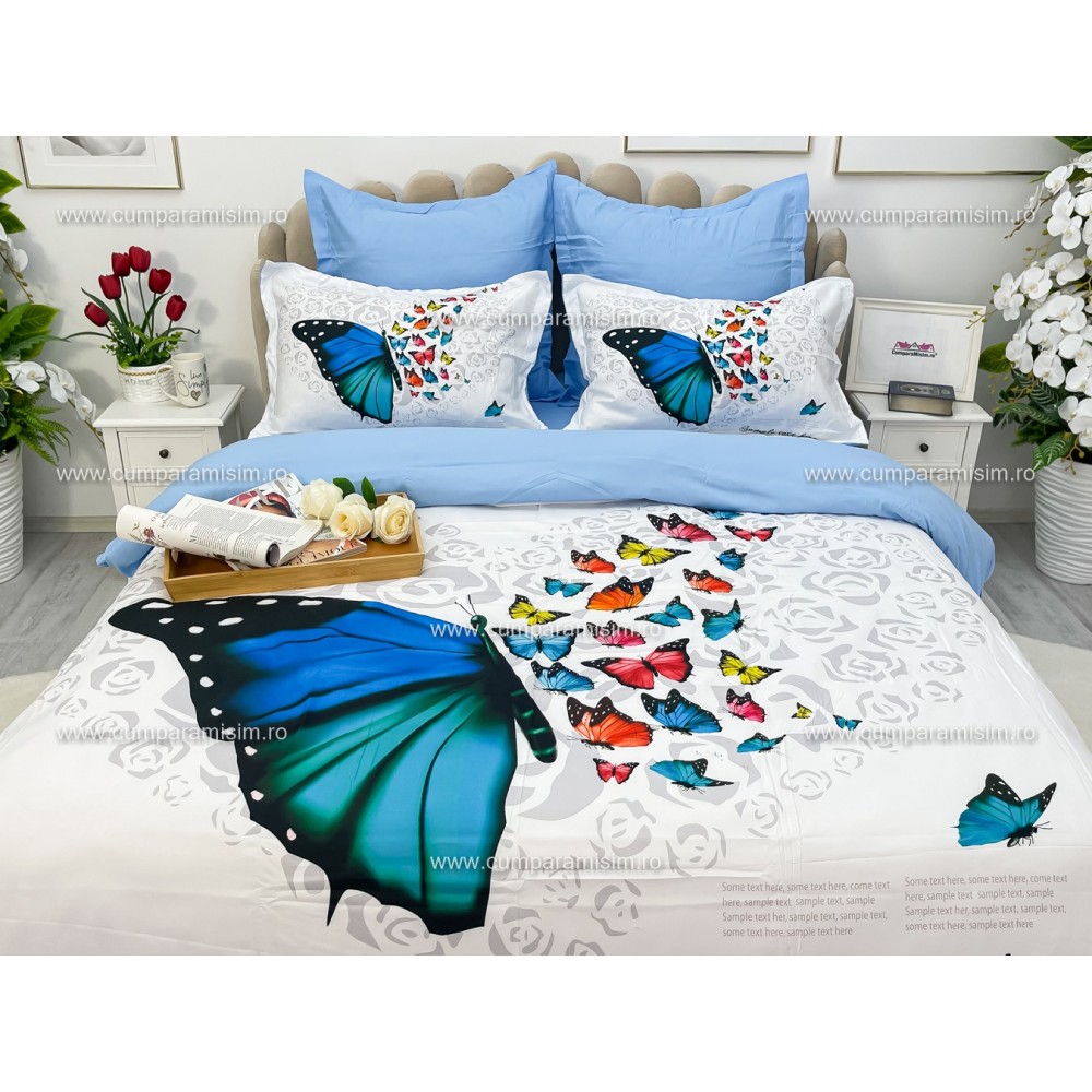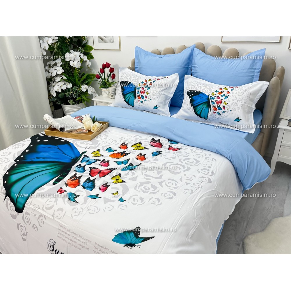 Lenjerie pat dublu, Ralex Pucioasa, 6 piese, Bumbac Finet, imprimeu 3D, IDENTIC CU POZA, Alb, fluturi, cod produs: RXF333