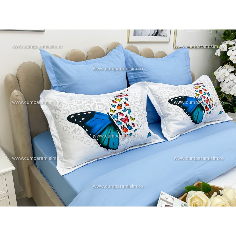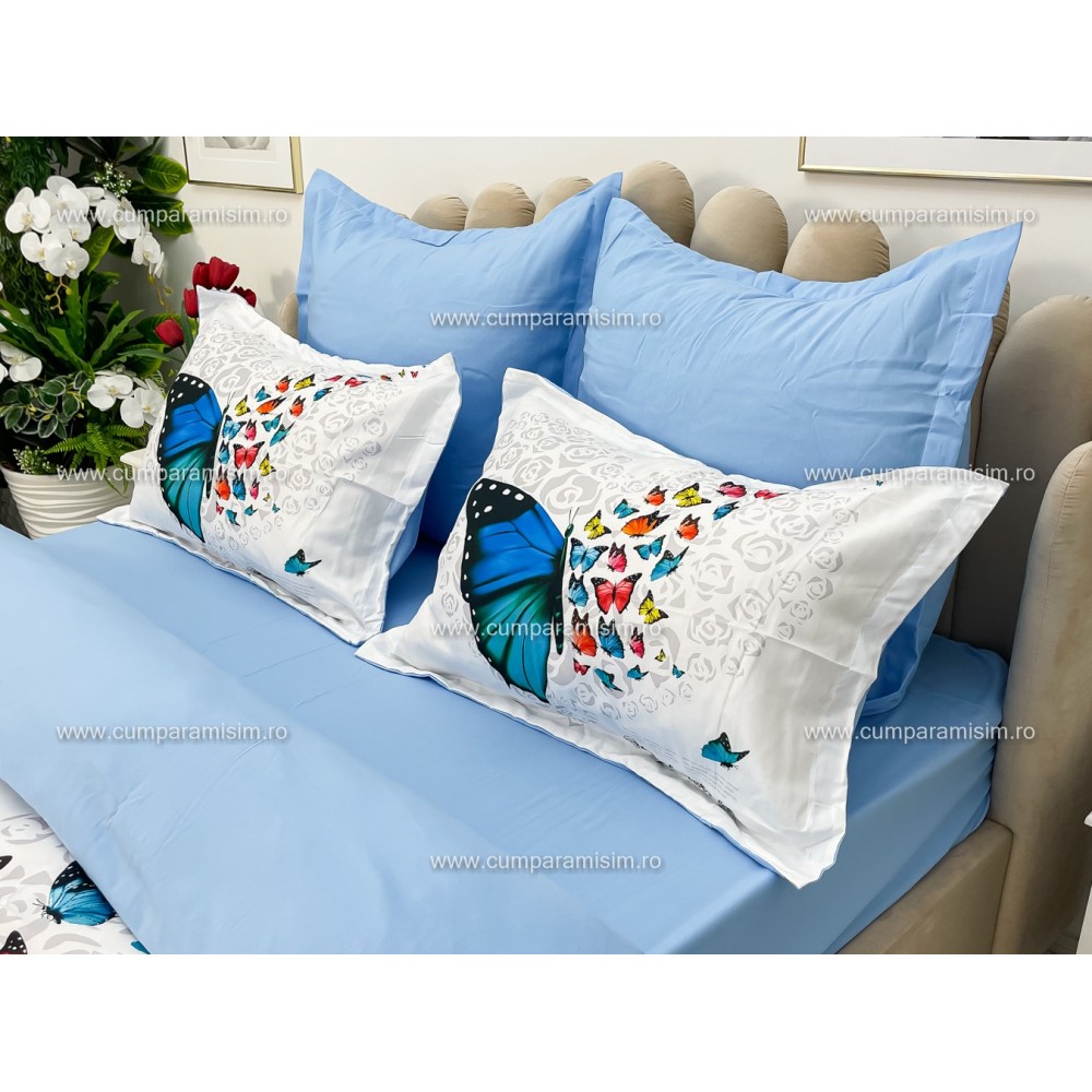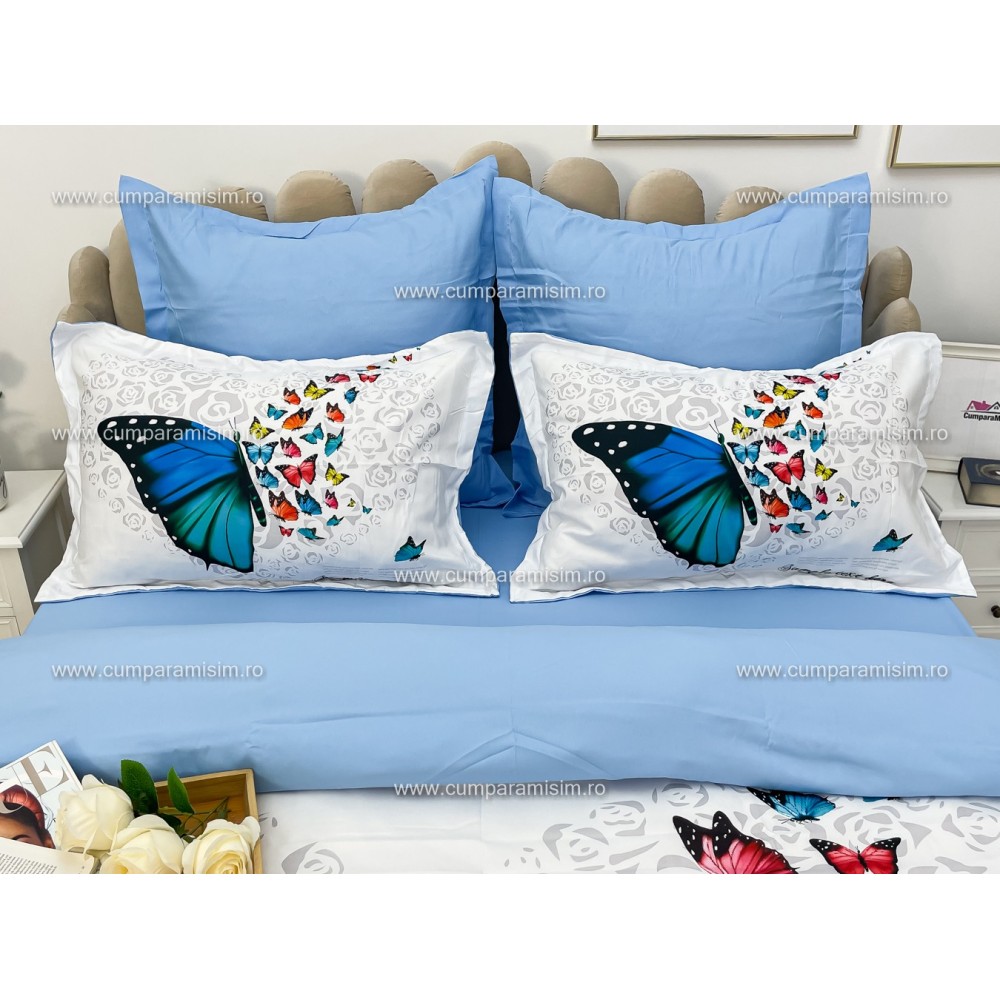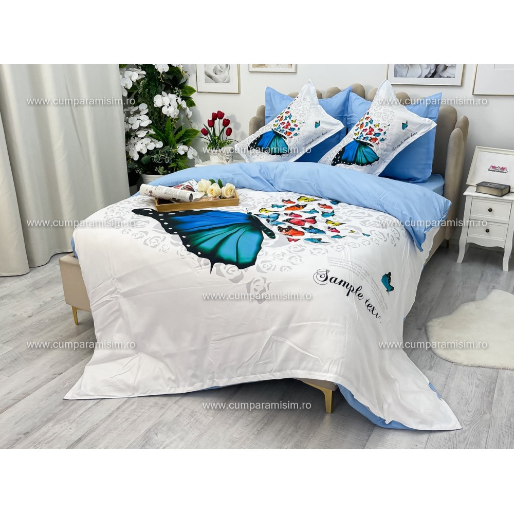 Lenjerie pat dublu, Ralex Pucioasa, 6 piese, Bumbac Finet, imprimeu 3D, IDENTIC CU POZA, Alb, fluturi, cod produs: RXF333