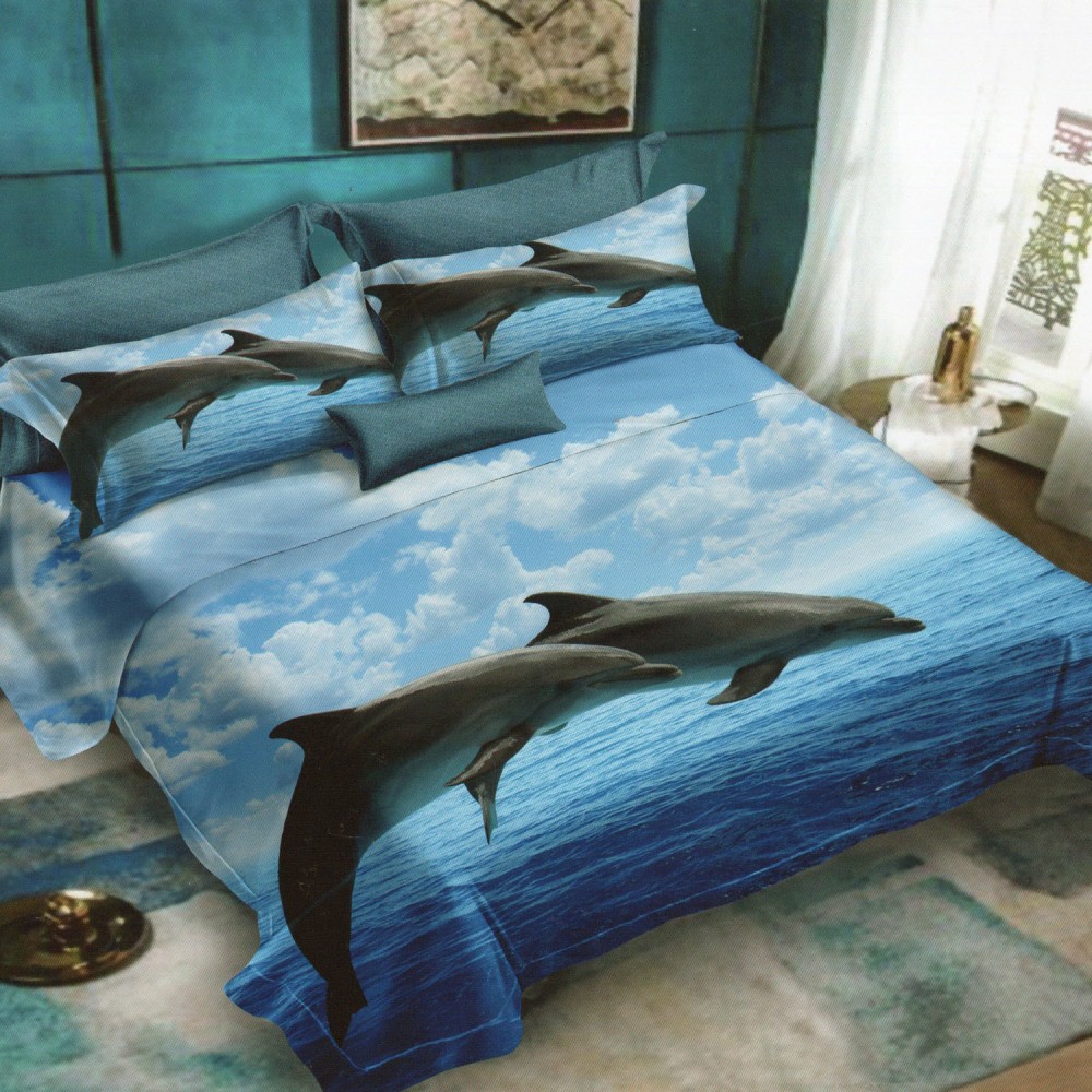 Lenjerie pat dublu, Ralex Pucioasa, 6 piese, Bumbac Finet, imprimeu 3D, IDENTIC CU POZA, Albastru, delfini, cod produs: RXF345