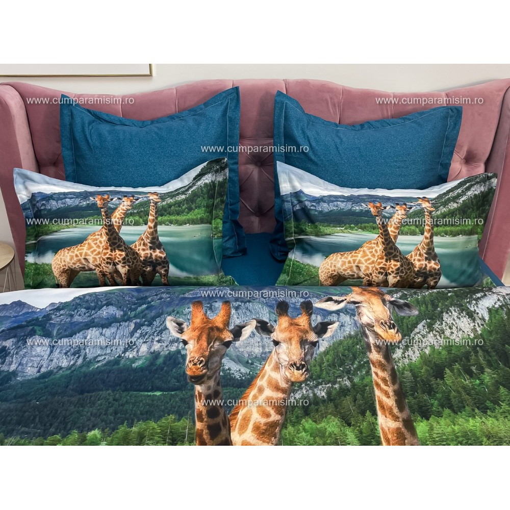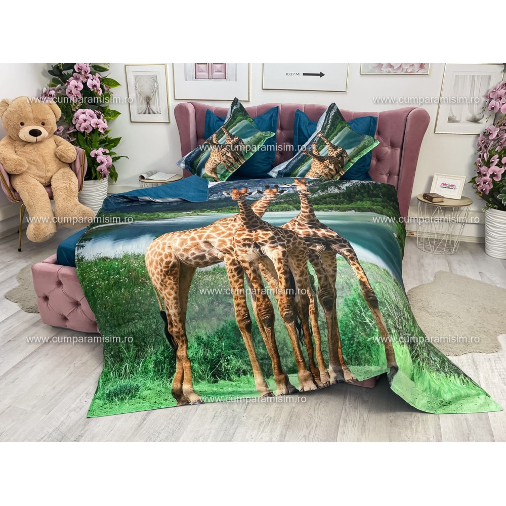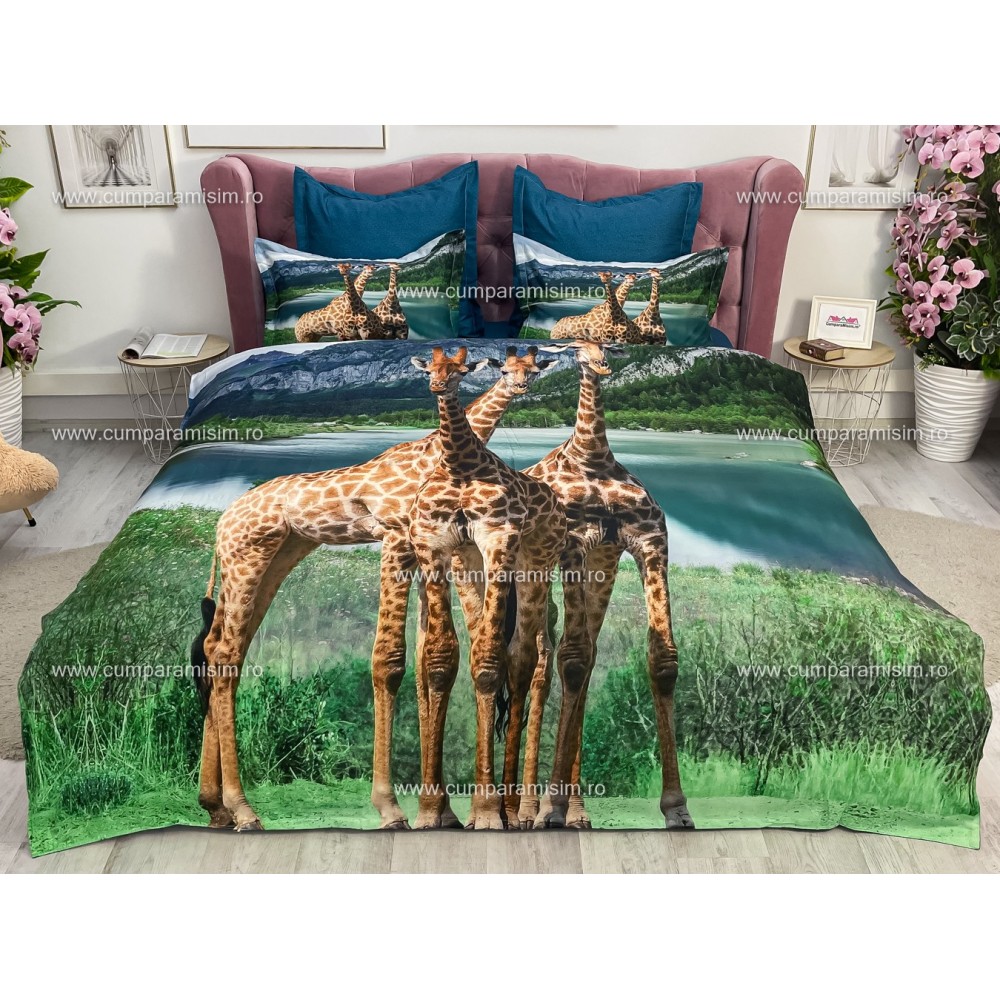 Lenjerie pat dublu, Ralex Pucioasa, 6 piese, Bumbac Finet, imprimeu 3D, IDENTIC CU POZA, Verde, girafe, cod produs: RXF346