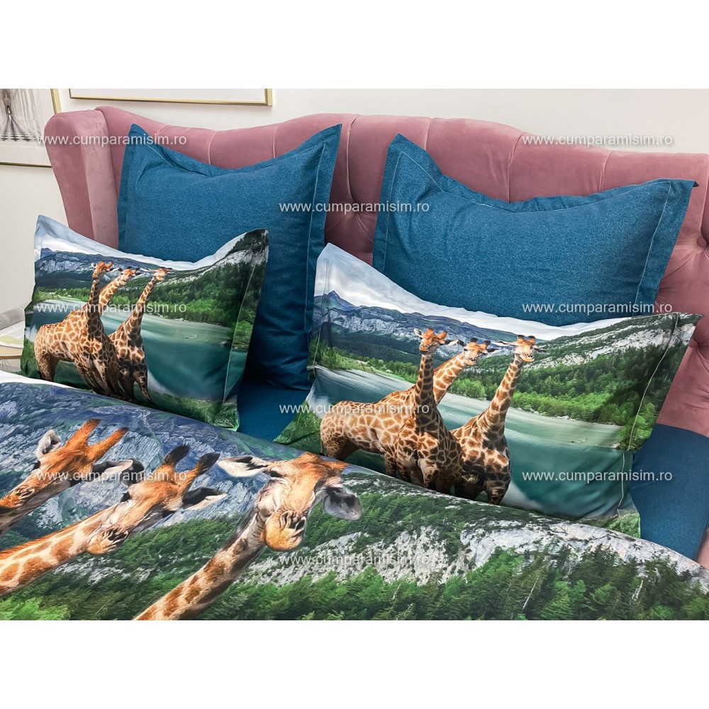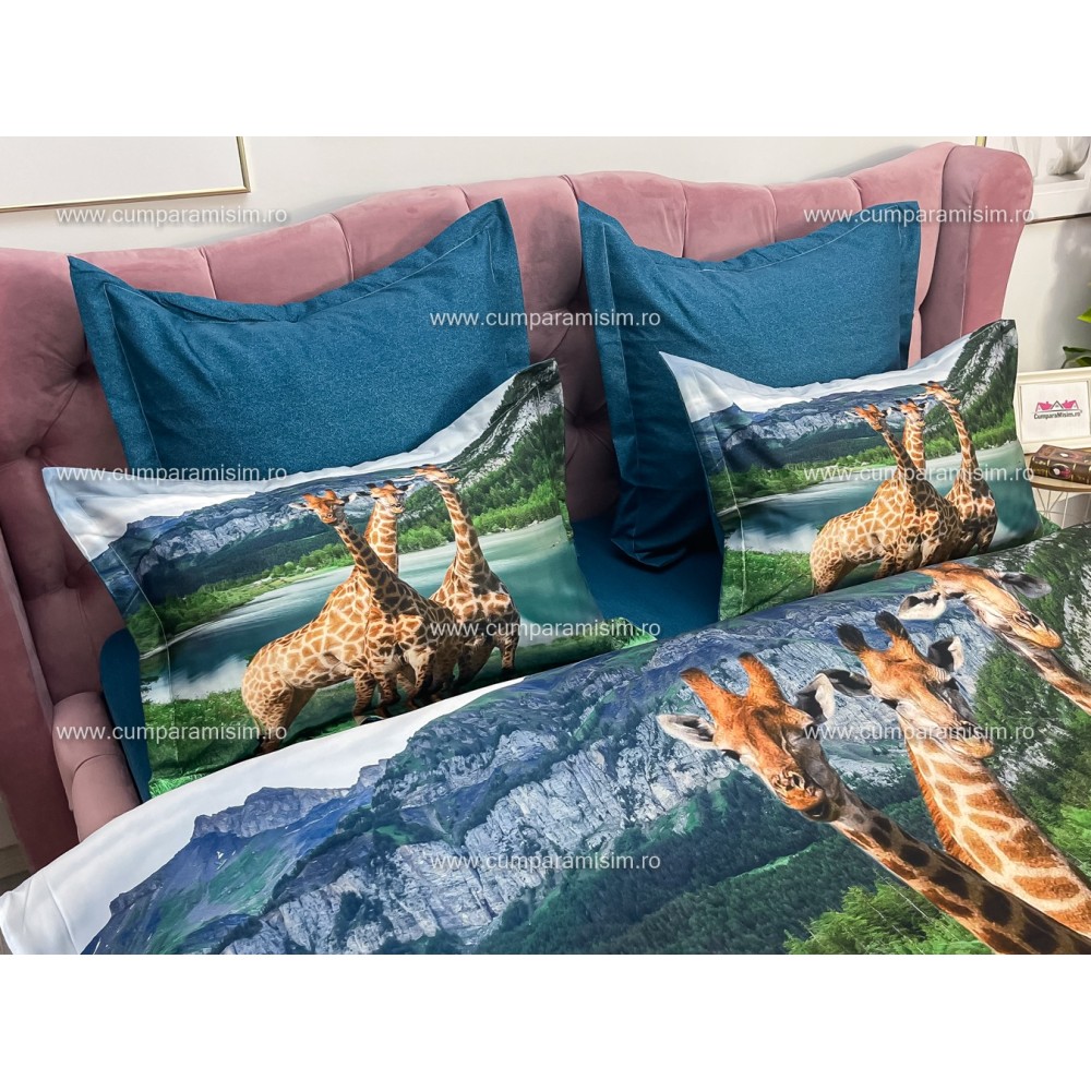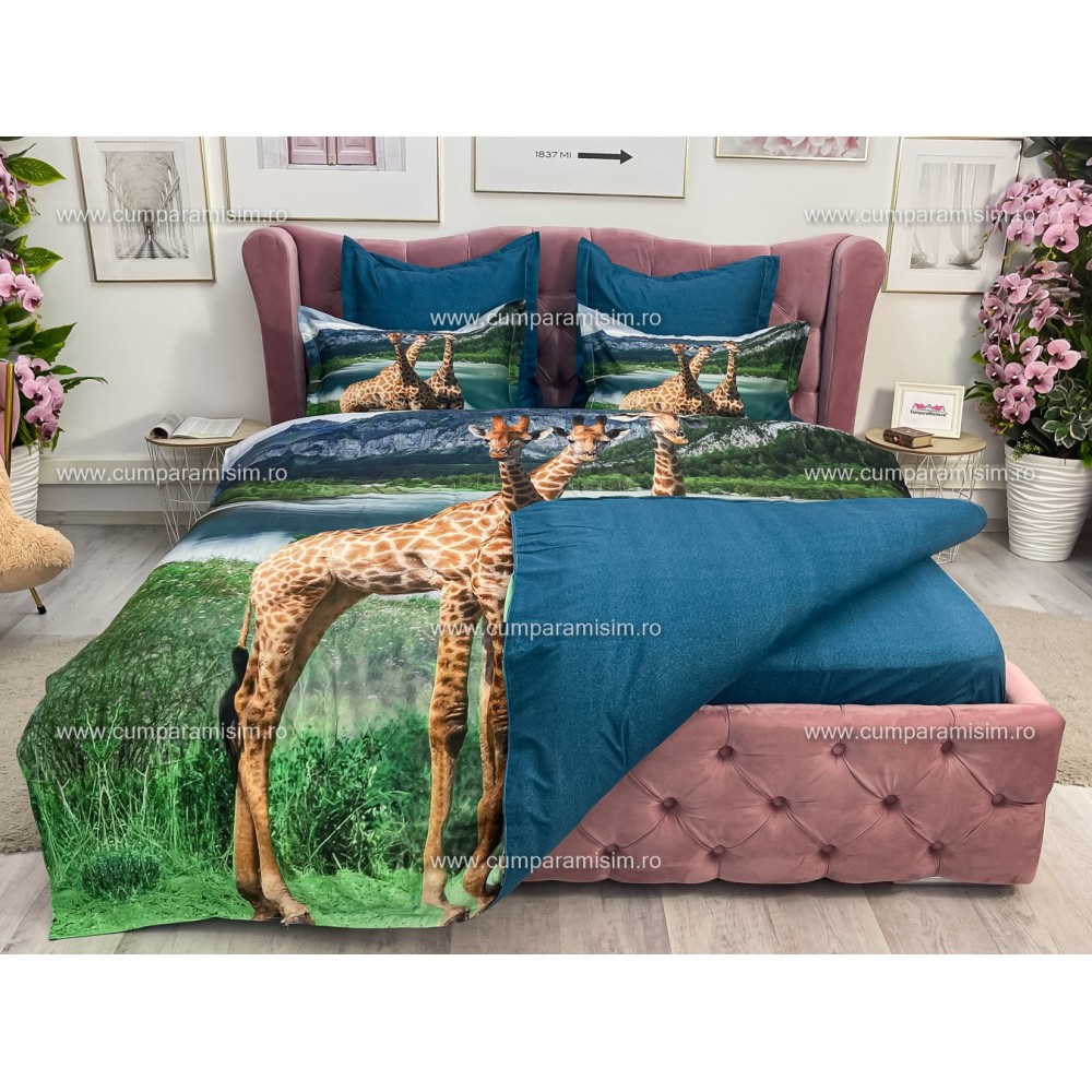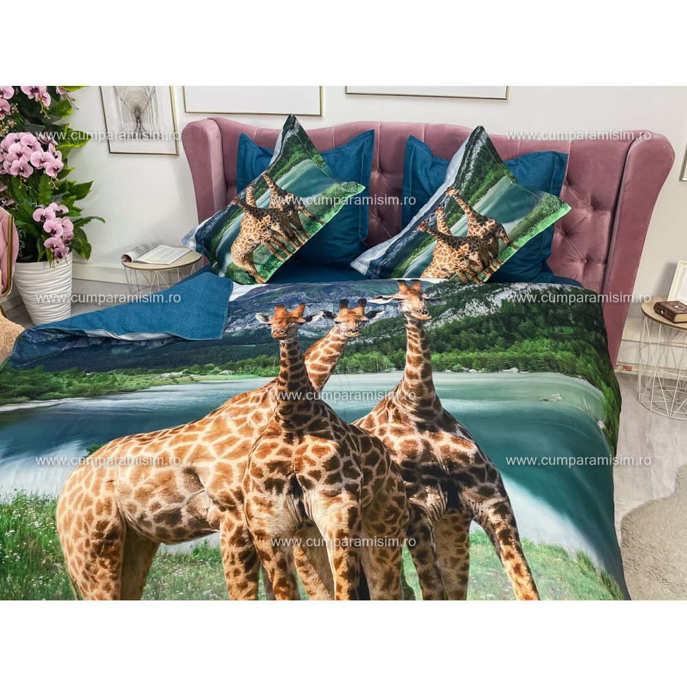 Lenjerie pat dublu, Ralex Pucioasa, 6 piese, Bumbac Finet, imprimeu 3D, IDENTIC CU POZA, Verde, girafe, cod produs: RXF346