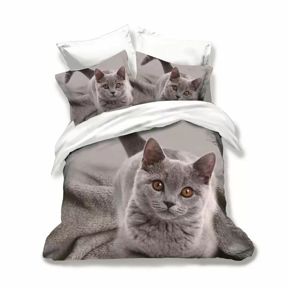 Lenjerie pat dublu, Ralex Pucioasa, 6 piese, Bumbac Finet, imprimeu 3D, IDENTIC CU POZA, Gri, pisica, cod produs: RXF354