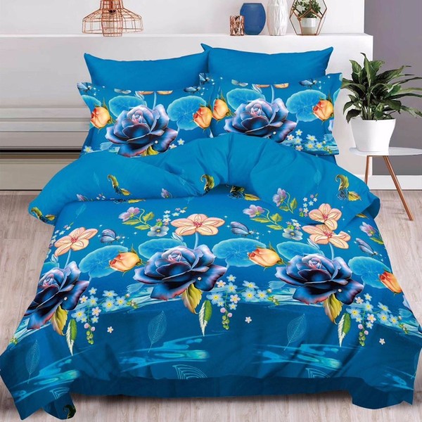 Lenjerie pat dublu, 6 PIESE, IMPRIMEU 3D Multiplicat, Microfibra, Albastru, flori, Johny Home Pucioasa, cod produs: SPR-B60-13
