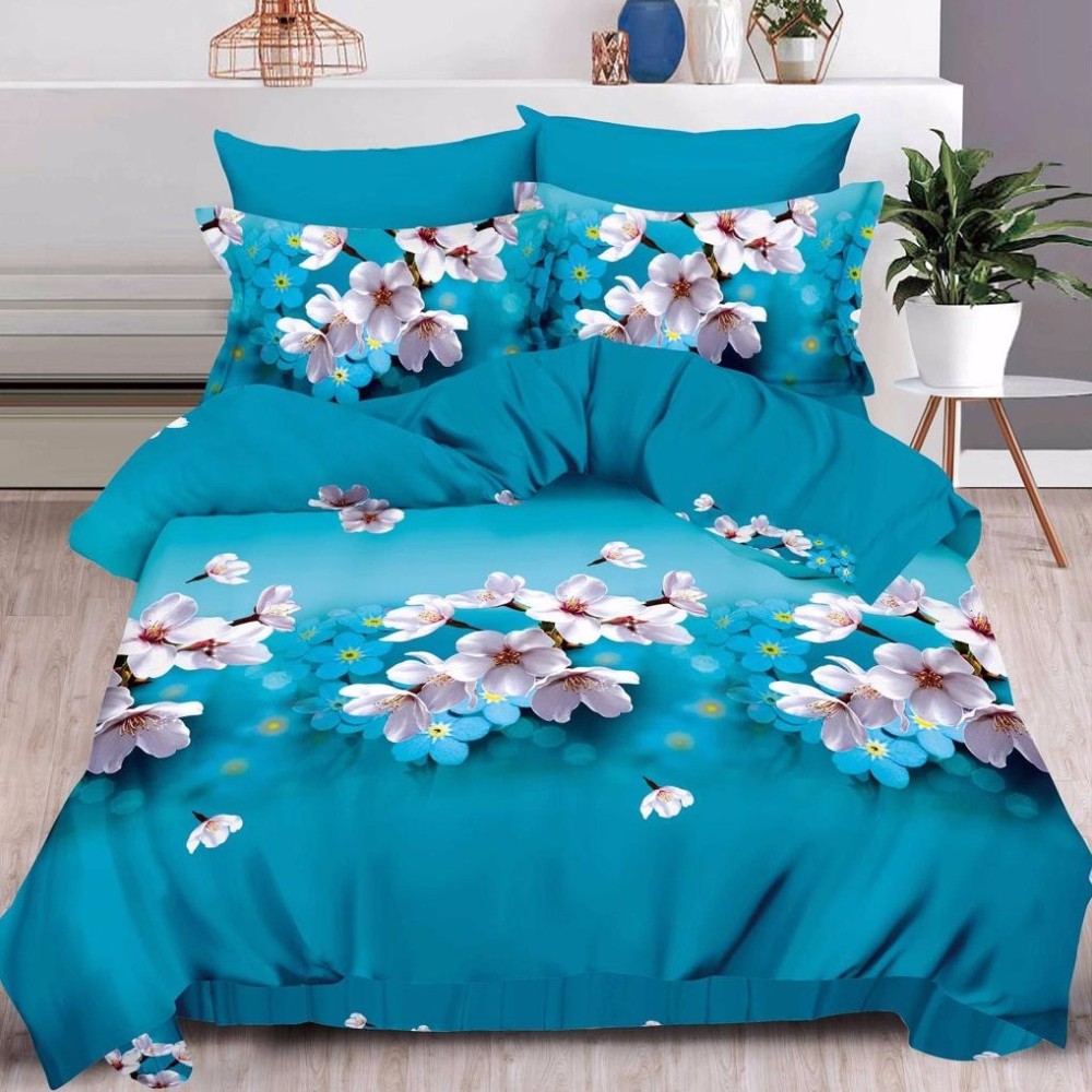 Lenjerie pat dublu, 6 PIESE, IMPRIMEU 3D Multiplicat, Microfibra, Albastru, flori de cires, Johny Home Pucioasa, cod produs: SPR-B60-22