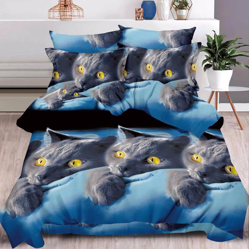 Lenjerie pat dublu, 6 PIESE, IMPRIMEU 3D Multiplicat, Microfibra, Albastru, pisici, Johny Home Pucioasa, cod produs: SPR-B60-24
