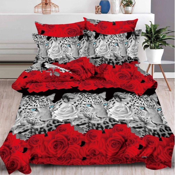 Lenjerie pat dublu, 6 PIESE, IMPRIMEU 3D Multiplicat, Microfibra, Gri-Rosu, leoparzi, trandafiri, Johny Home Pucioasa, cod produs: SPR-B60-11