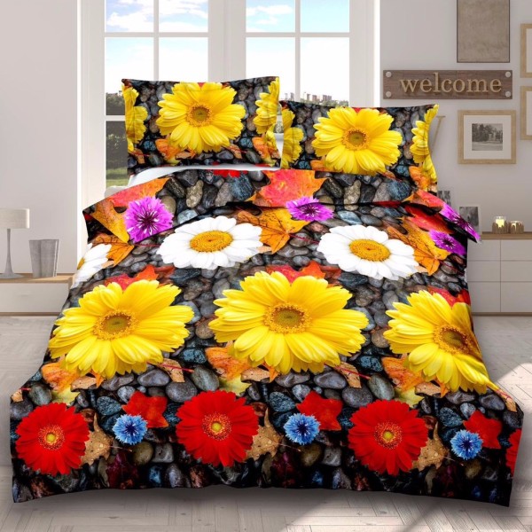 Lenjerie pat dublu, 6 PIESE, IMPRIMEU 3D Multiplicat, Microfibra, Rosu-Galben, flori, Johny Home Pucioasa, cod produs: SPR-B60-09