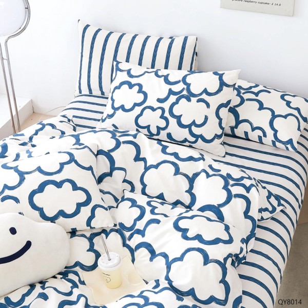 Lenjerie pat dublu, BUMBAC 100% Percal, cu Elastic, 4 piese, Alb, Albastru, Norișori, Dungi, Primavara Casa, cod produs: PRM-BD-QY8014