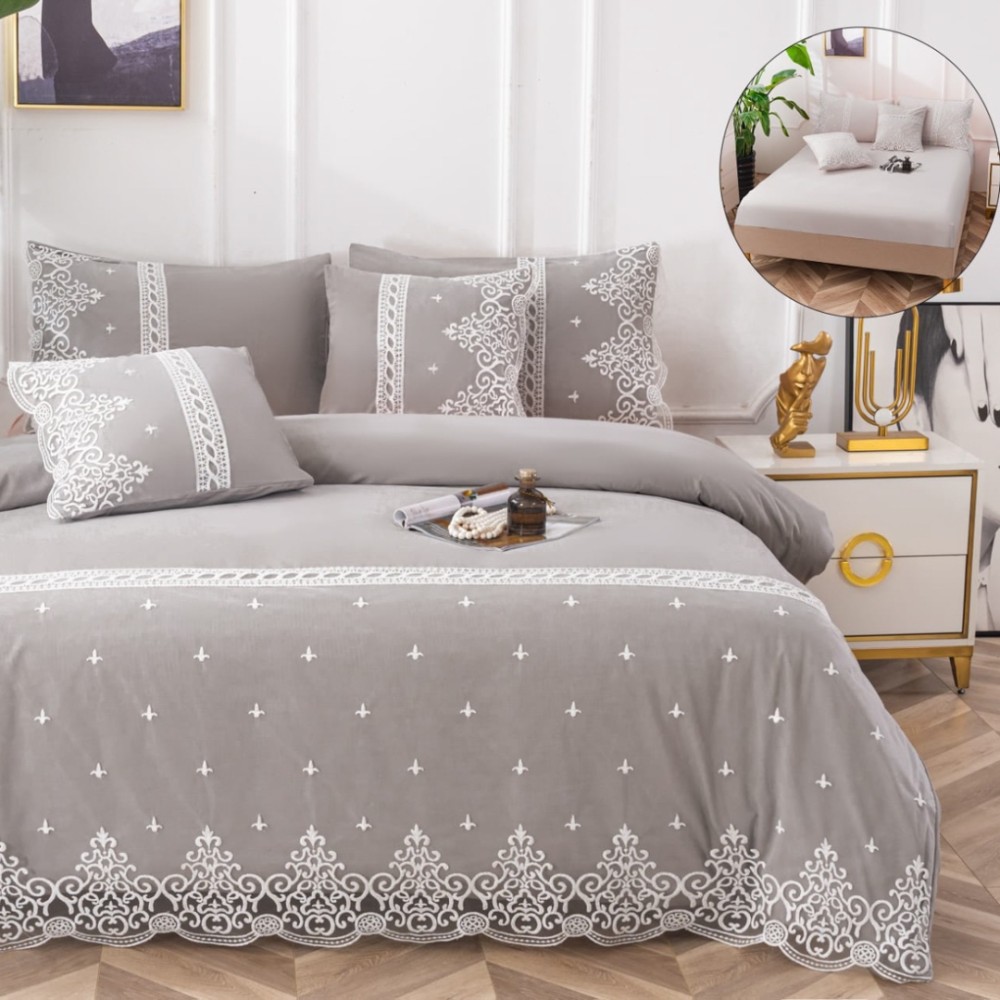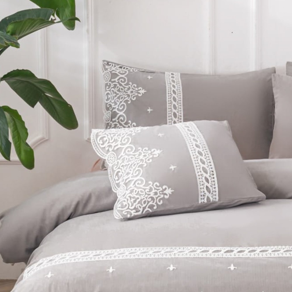 Lenjerie pat dublu, Bumbac Fin cu Dantela si Broderie Rafinata, CEARSAF CU ELASTIC, 6 piese, Gri, JOJO Home, cod produs: PTD7