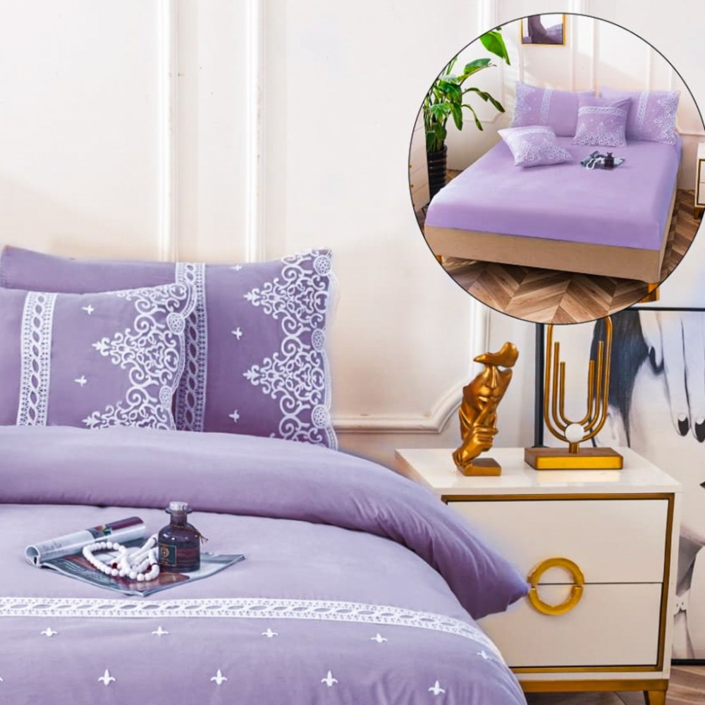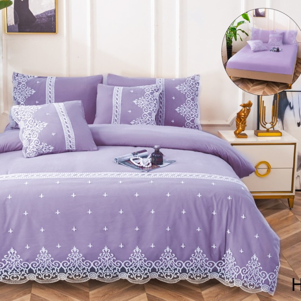 Lenjerie pat dublu, Fin cu Dantela si Broderie Rafinata, CEARSAF CU ELASTIC, 6 piese, Lila, Casa Minunata, cod produs: INS-BFD08