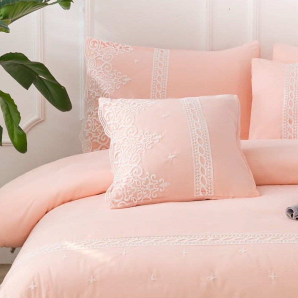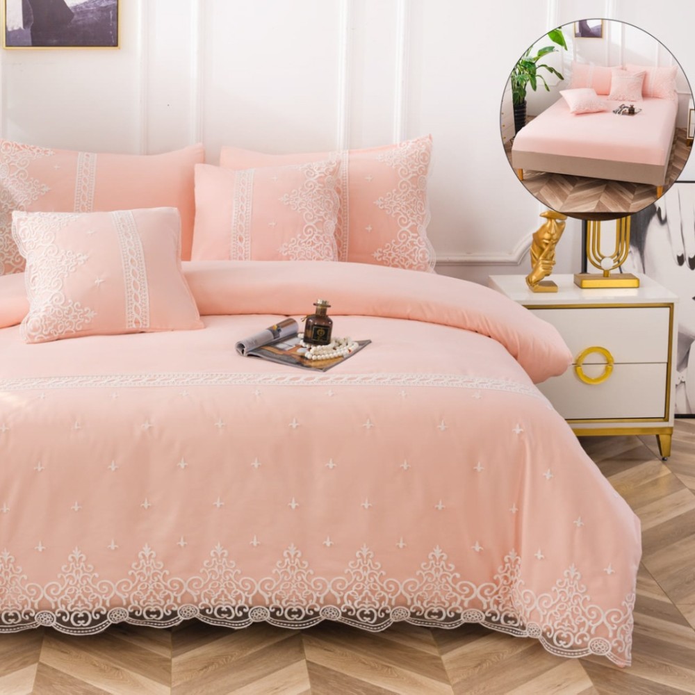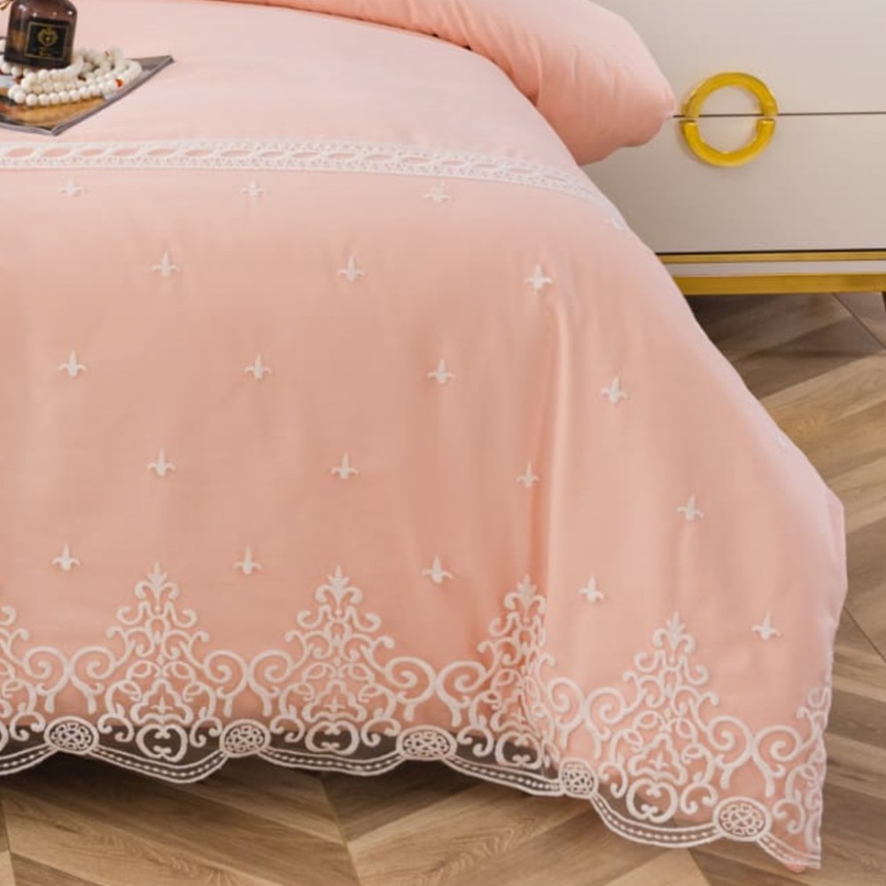 Lenjerie pat dublu, Bumbac Fin cu Dantela si Broderie Rafinata, CEARSAF CU ELASTIC, 6 piese, Somon, JOJO Home, cod produs: PTD8