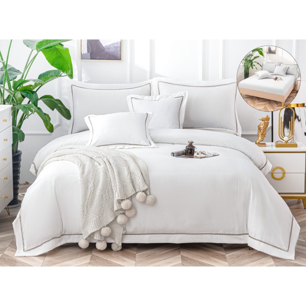 Lenjerie pat dublu, Bumbac Fin Texturat, CEARSAF CU ELASTIC, 6 piese, Alb, JOJO Home, cod produs: PTB1