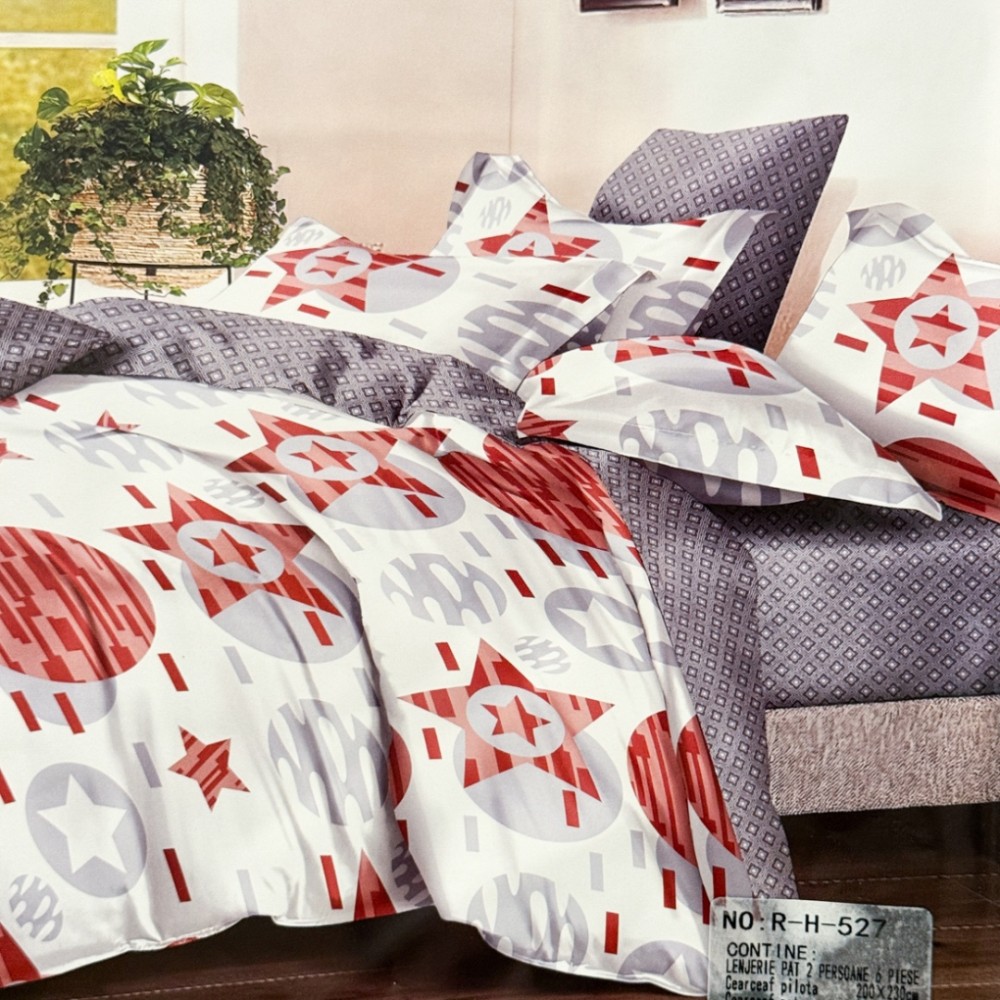 Lenjerie pat dublu, FINET, 6 piese, Alb, Gri, Roșu, steluțe, buline, Johny Home Pucioasa, cod produs: DKF185