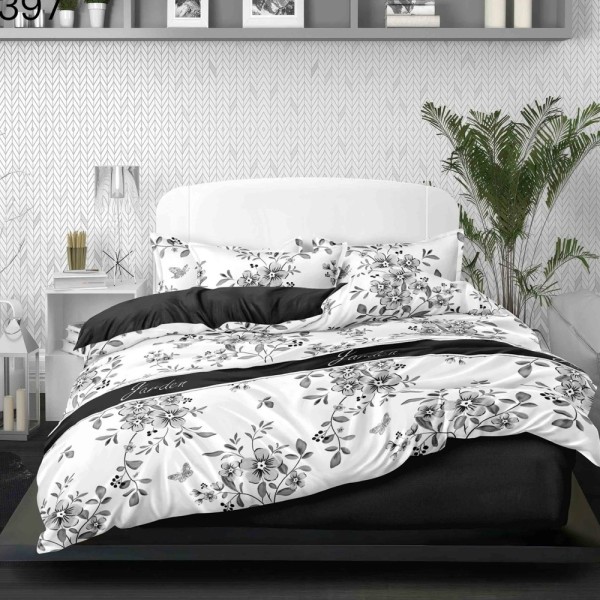 Lenjerie Pat Dublu, FINET, 6 piese, Alb, Negru, flori, East Romania, cod produs: EST-FN-397