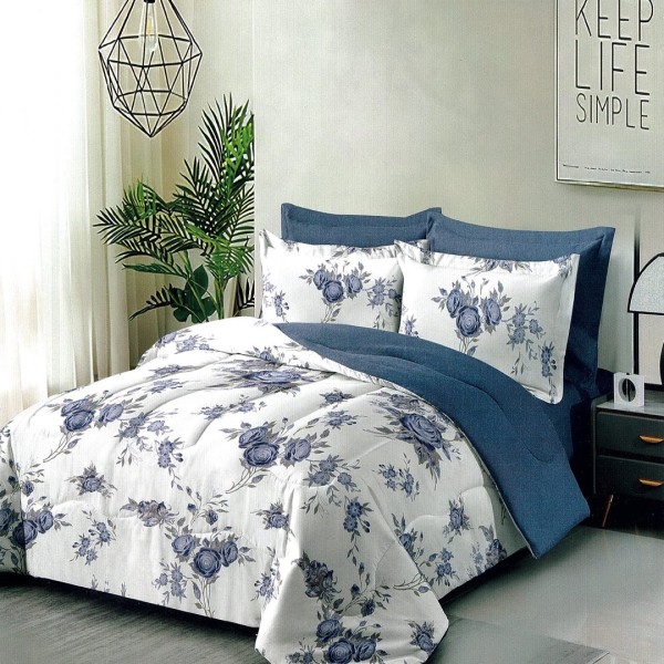 Lenjerie pat dublu, FINET, 6 piese, Albastru, trandafiri, Johny Home Pucioasa, cod produs: DKF56