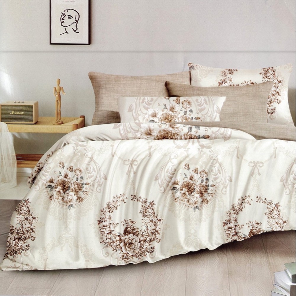 Lenjerie pat dublu, FINET, 6 piese, Bej, flori, fundite, Johny Home Pucioasa, cod produs: DKF168