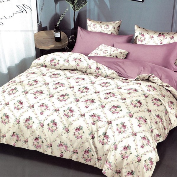 Lenjerie pat dublu, FINET, 6 piese, Bej-Lila, flori, Johny Home Pucioasa, cod produs: DKF171