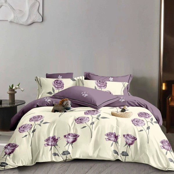 Lenjerie Pat Dublu, FINET, 6 piese, Crem, Mov, flori, East Romania, cod produs: EST-FN-306