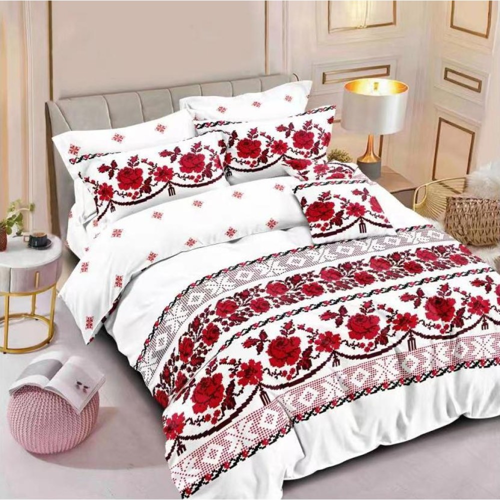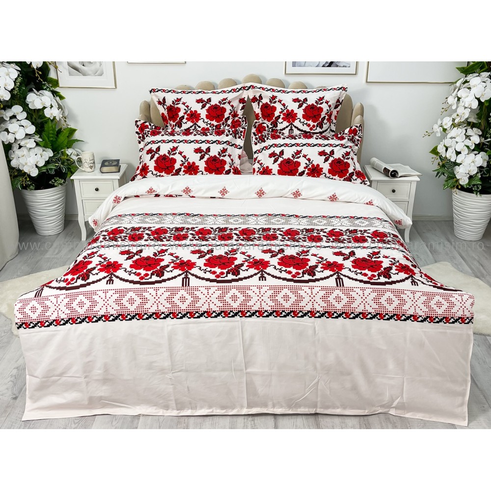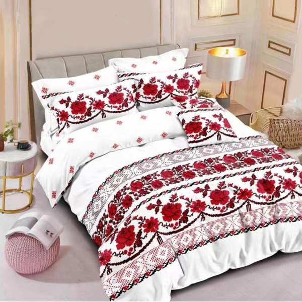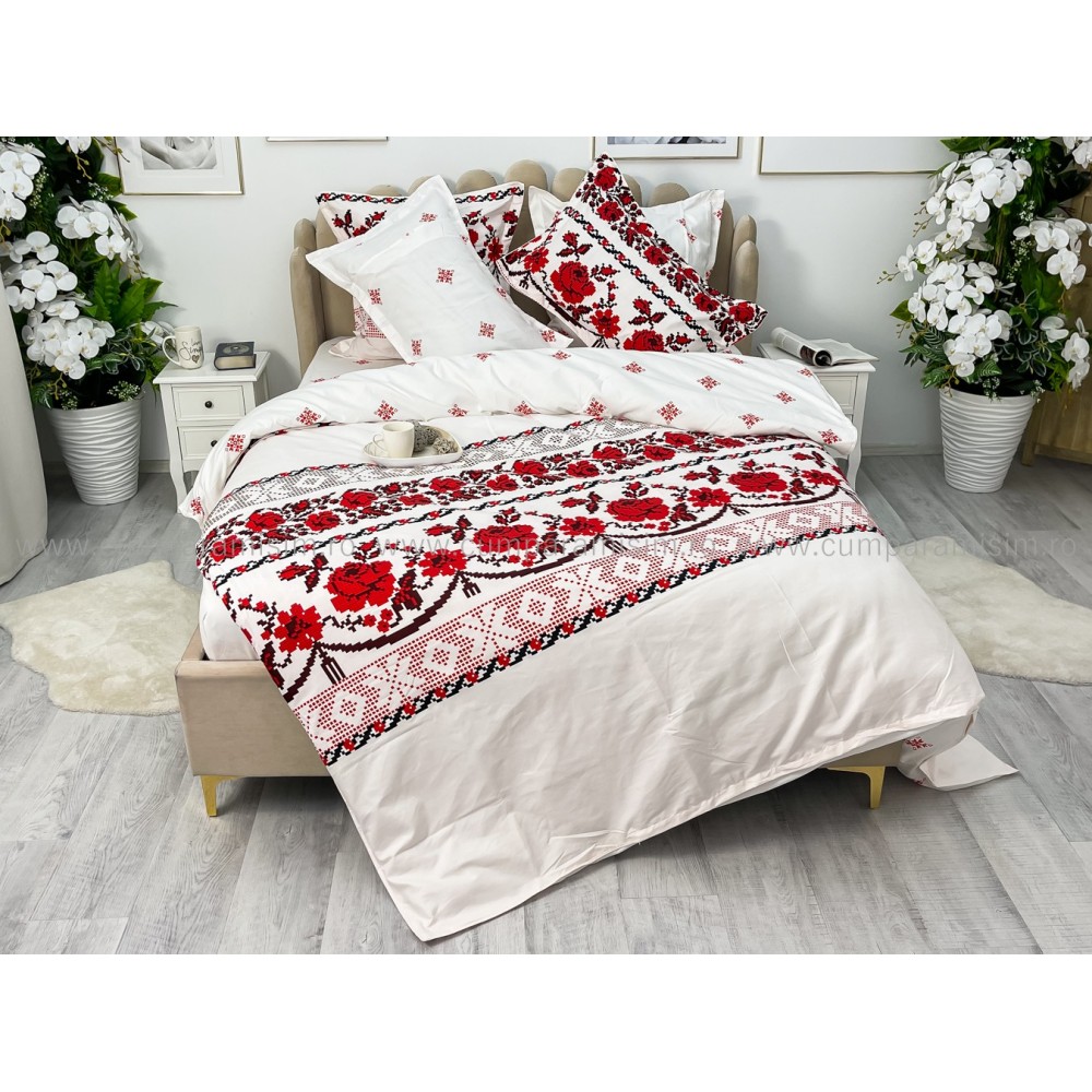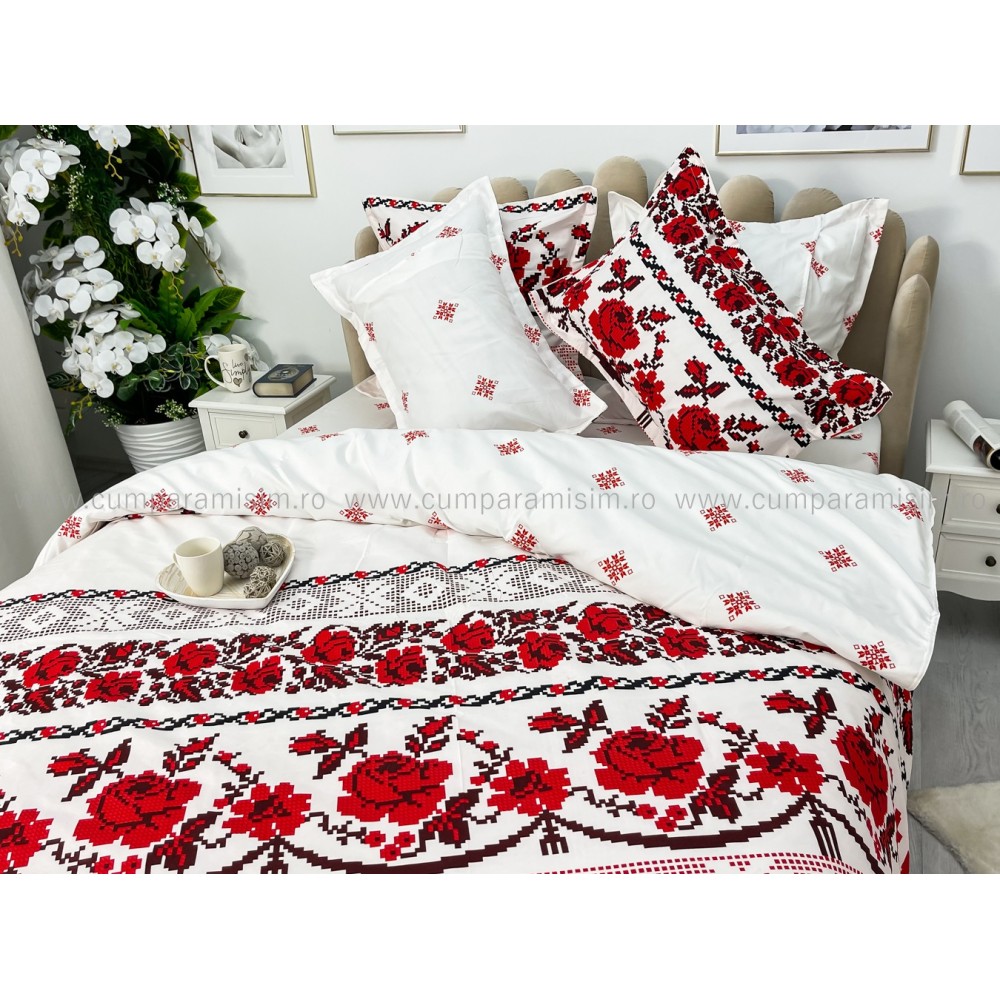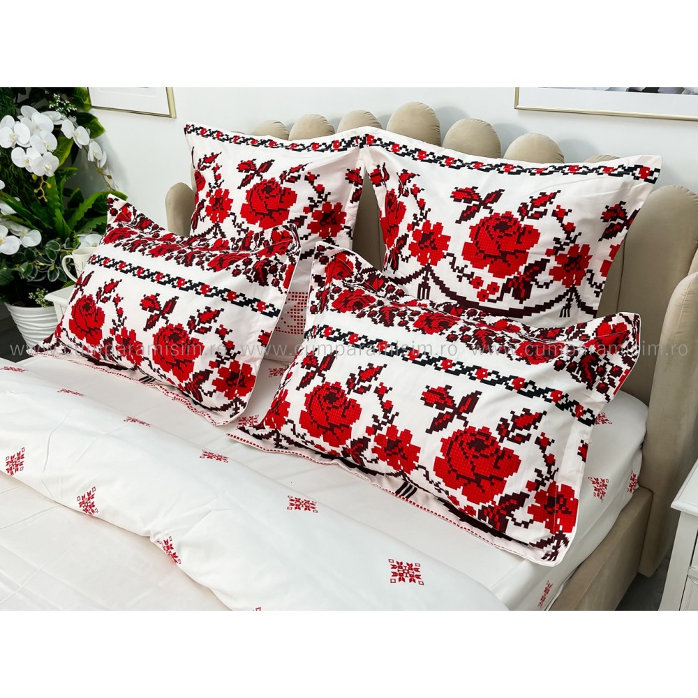 Lenjerie pat dublu, FINET, 6 piese, cu ELASTIC, Alb-Rosu, model traditional, Johny Home Pucioasa, cod produs: SPR-T-196