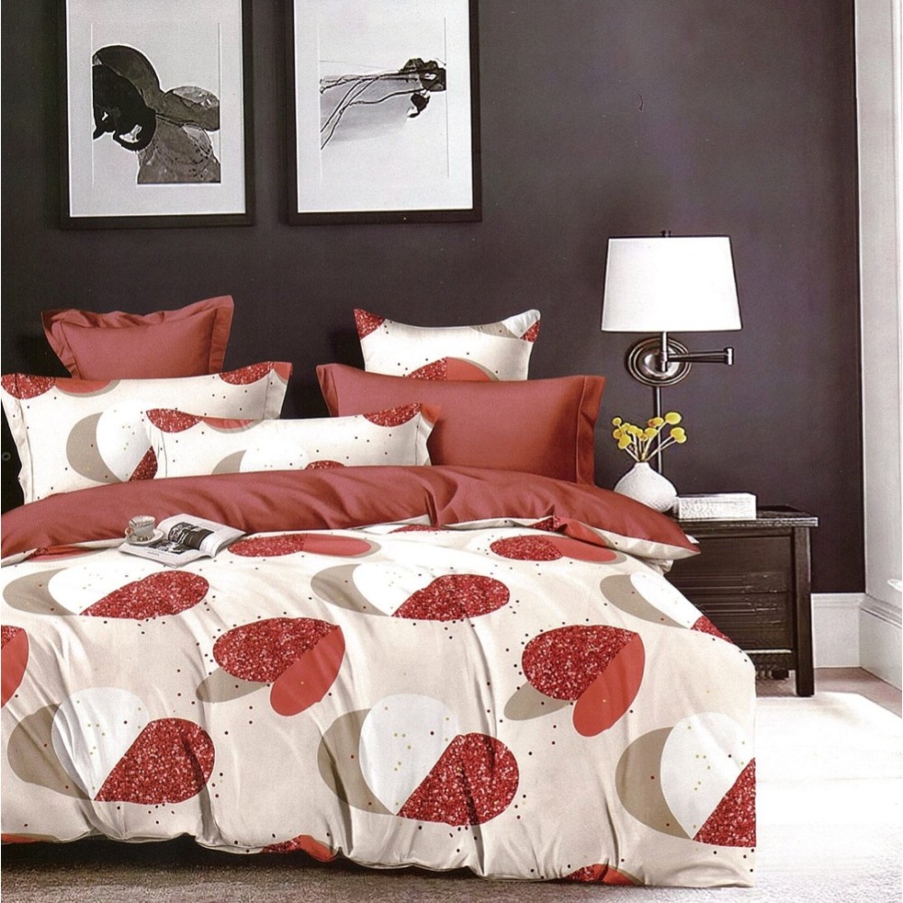 Lenjerie pat dublu, FINET, 6 piese, cu ELASTIC, Bej-Rosu, inimioare, Johny Home Pucioasa, cod produs: DKT10