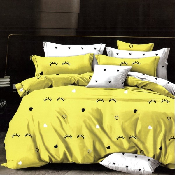 Lenjerie pat dublu, FINET, 6 piese, cu ELASTIC, Galben, gene, inimioare, Johny Home Pucioasa, cod produs: DKT35