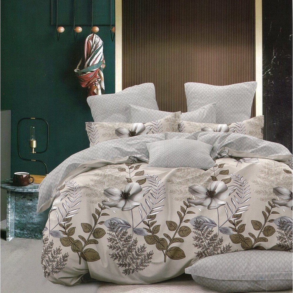 Lenjerie pat dublu, FINET, 6 piese, cu ELASTIC, Grej, flori, Johny Home Pucioasa, cod produs: DKT9