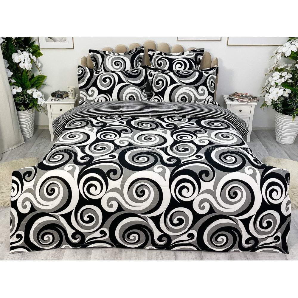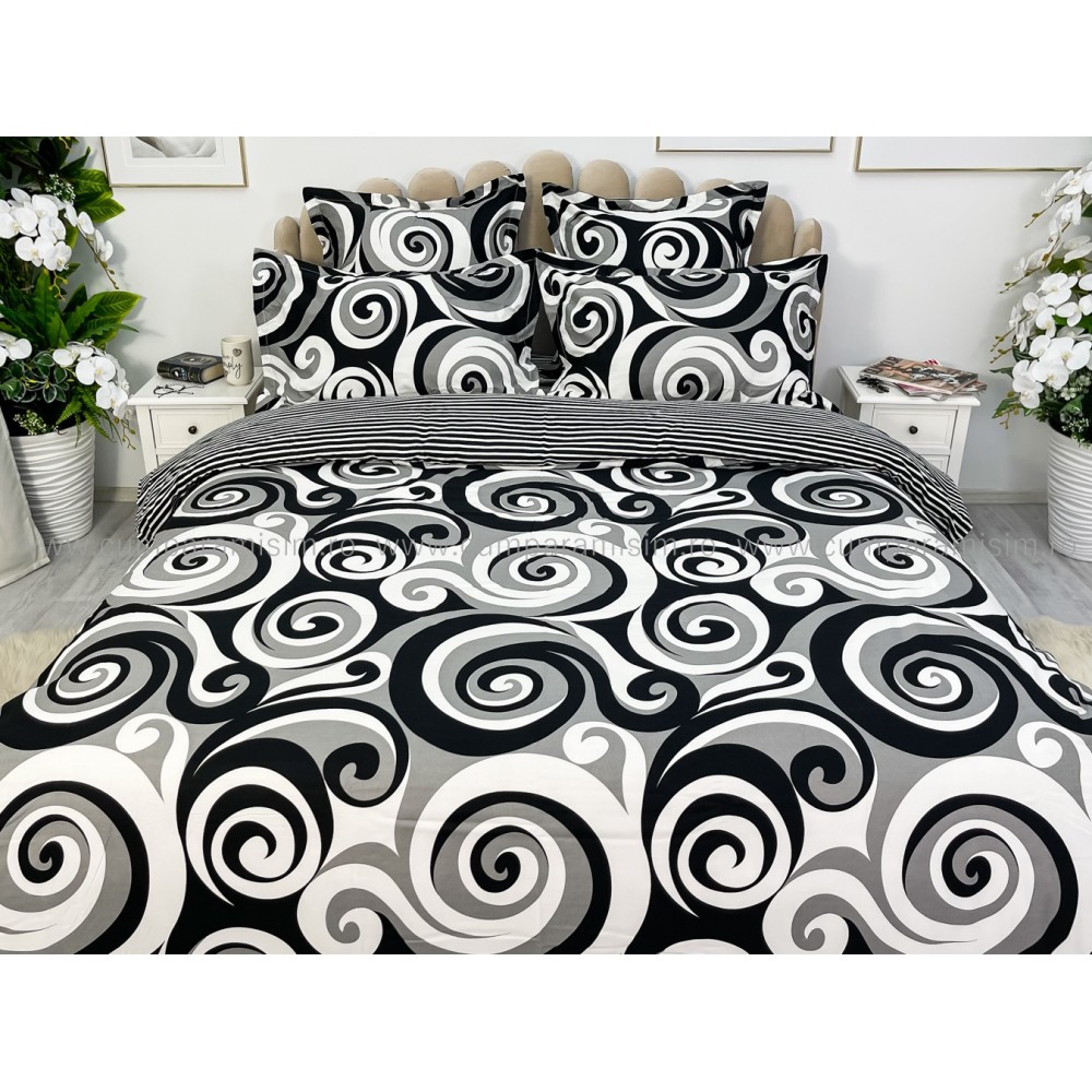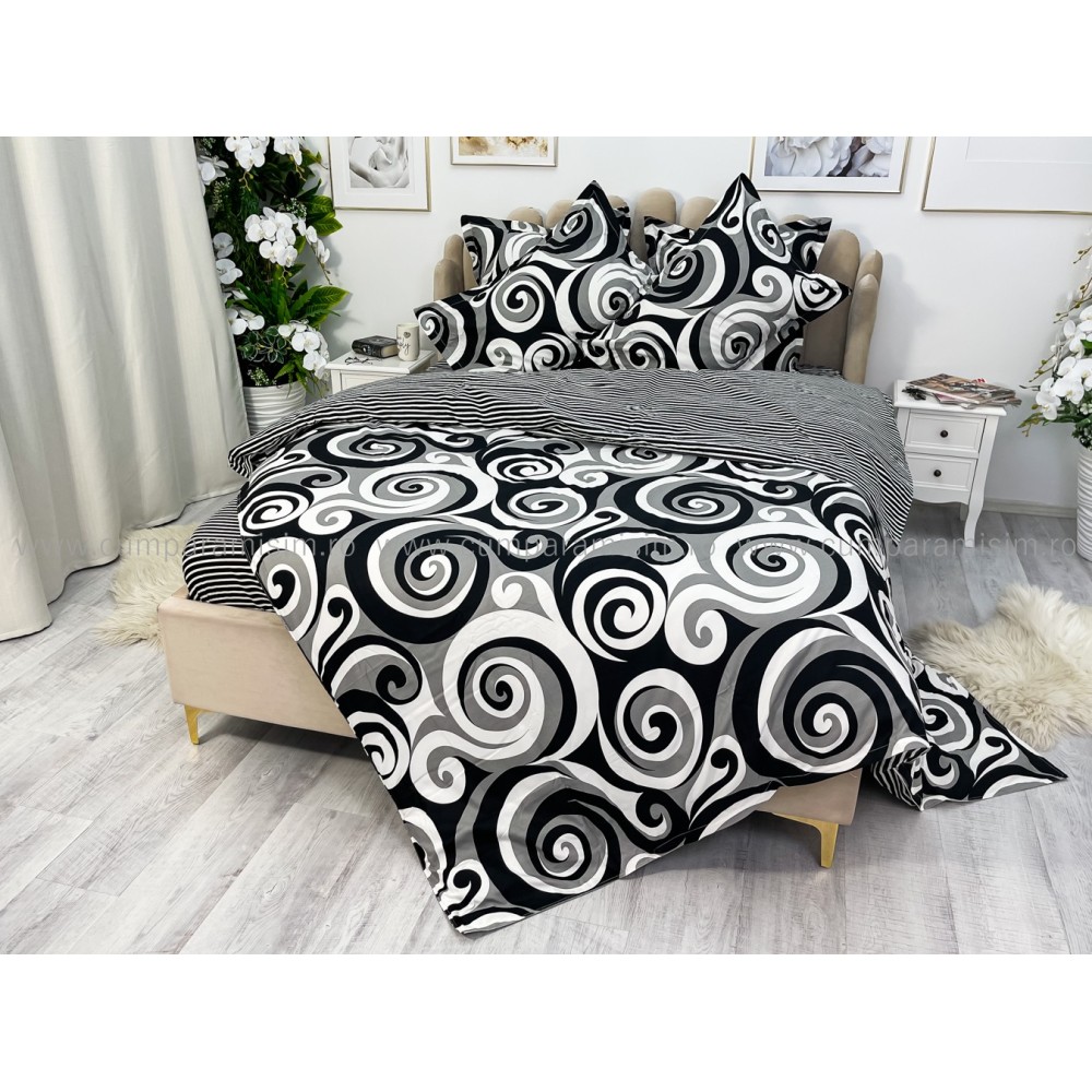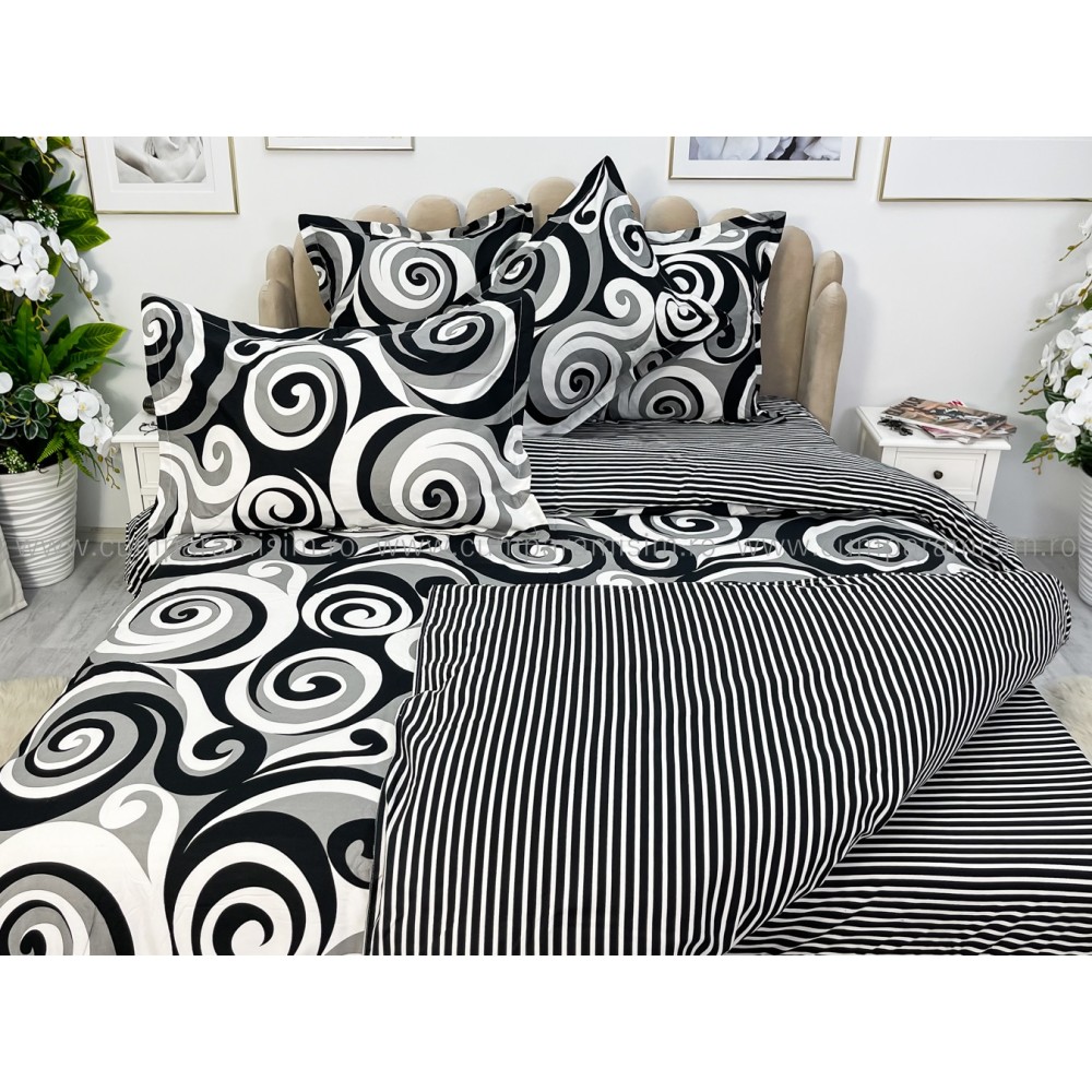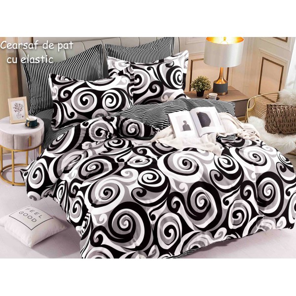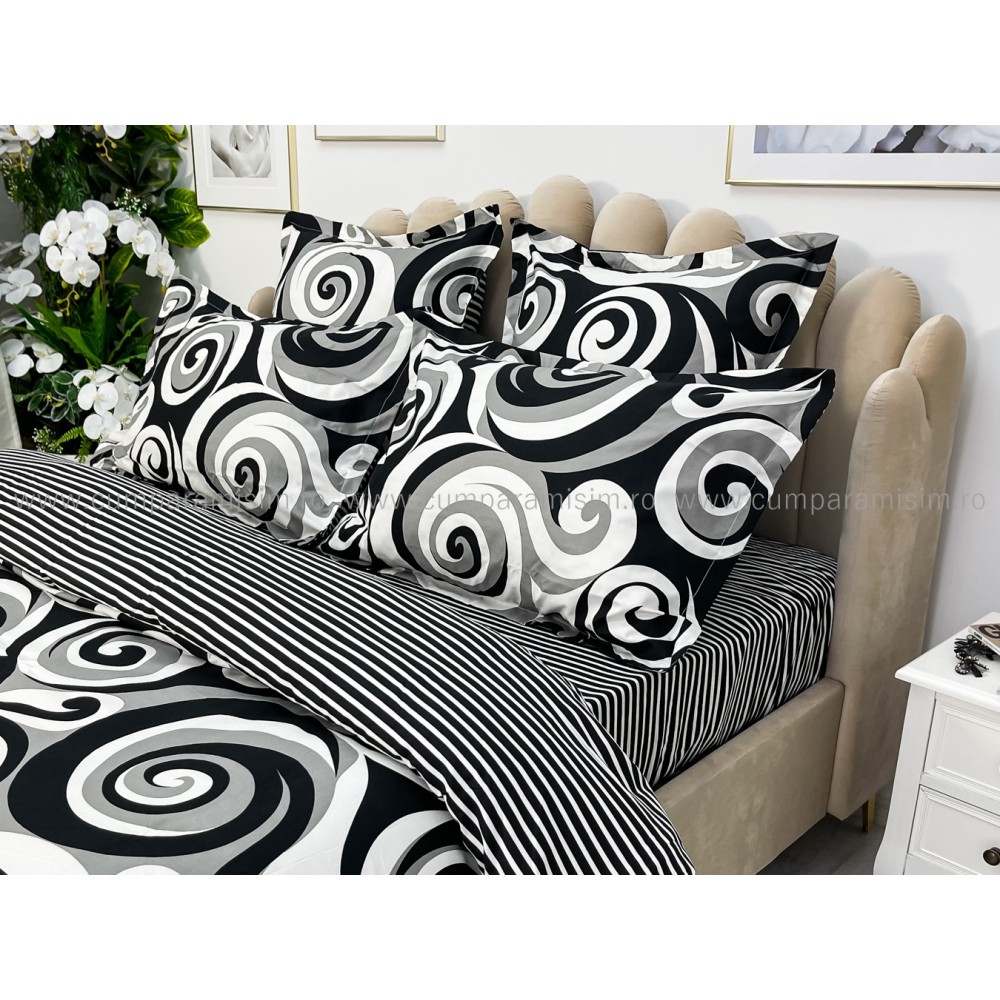 Lenjerie pat dublu, FINET, 6 piese, cu ELASTIC, Jojo Home, Alb-Negru, abstract, cod produs: JOF301
