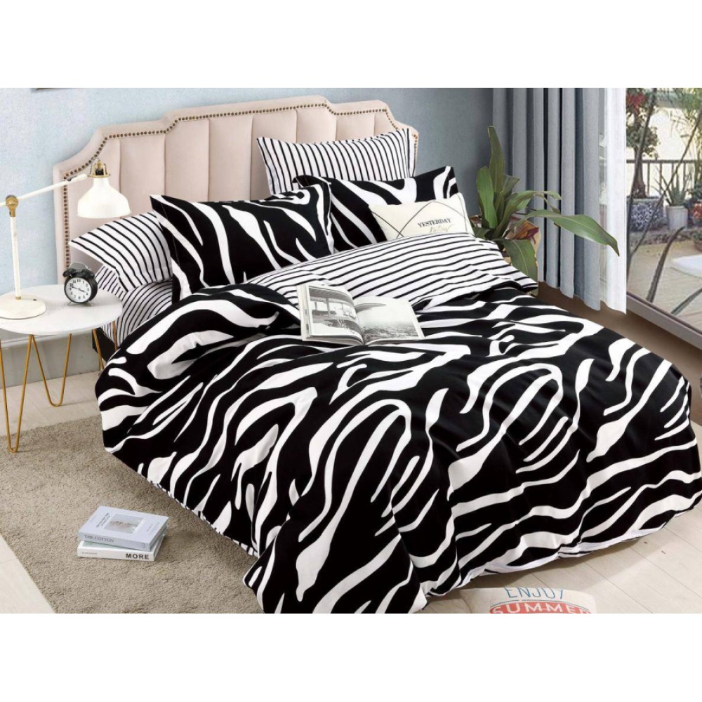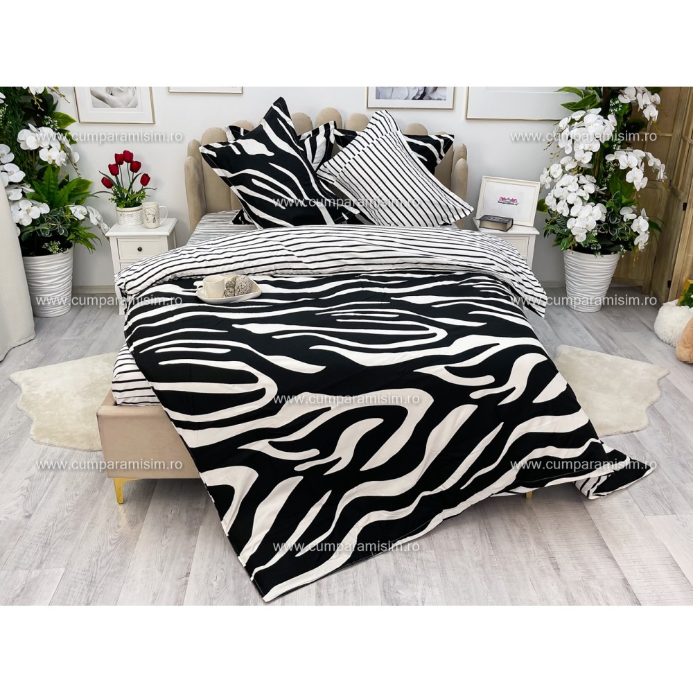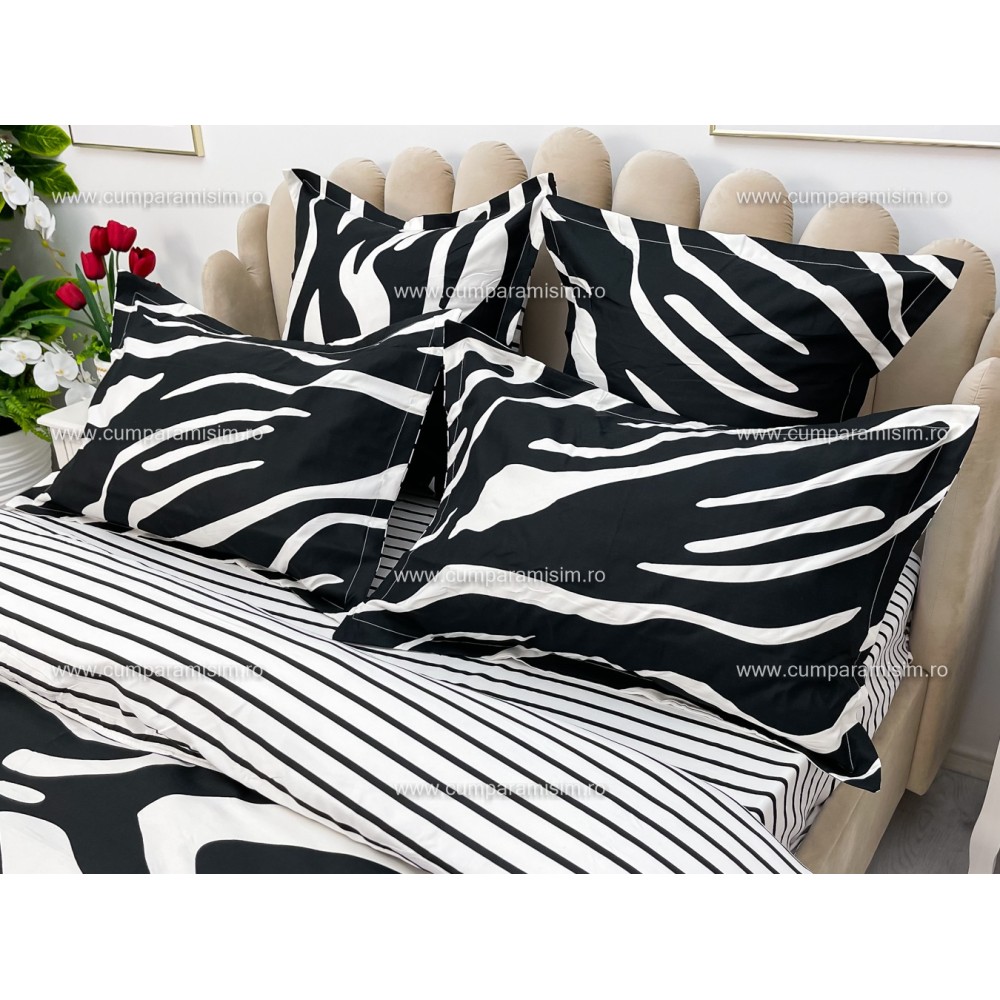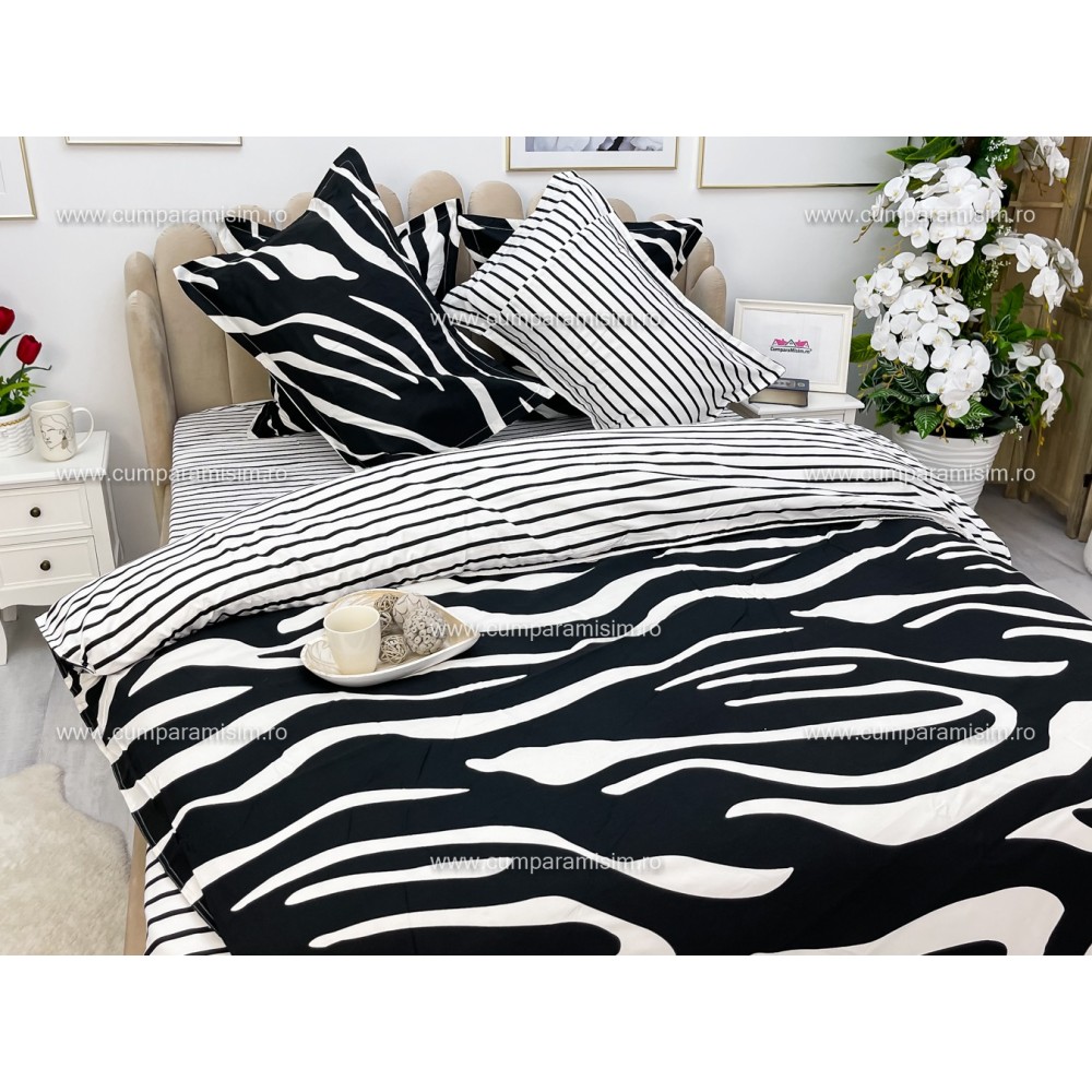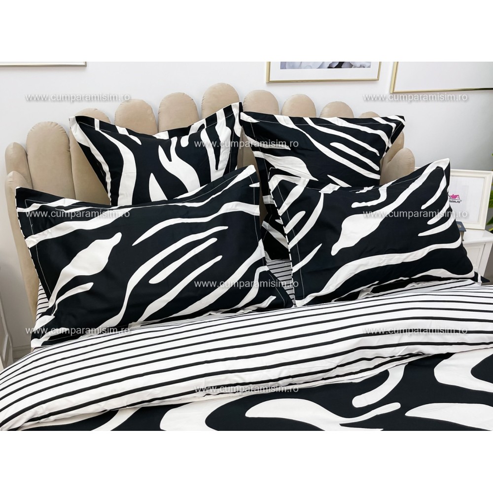 Lenjerie pat dublu, FINET, 6 piese, cu ELASTIC, Jojo Home, Alb-Negru, animal print, cod produs: JOF360