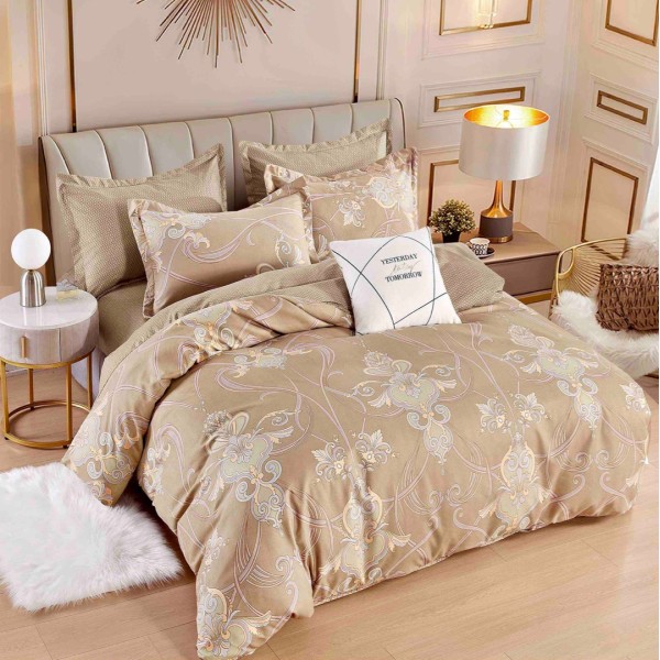 Lenjerie pat dublu, FINET, 6 piese, cu ELASTIC, Jojo Home, Bej, model oriental, cod produs: JOF436