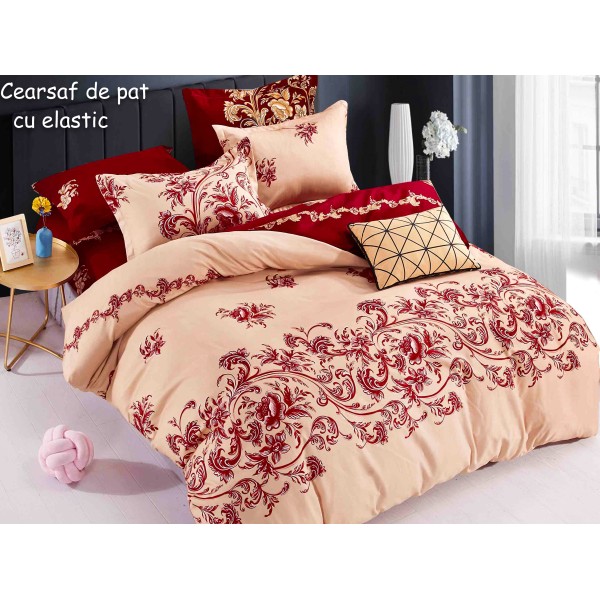 Lenjerie pat dublu, FINET, 6 piese, cu ELASTIC, Jojo Home, Bej-Visiniu, flori, cod produs: JOF305