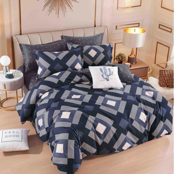 Lenjerie pat dublu, FINET, 6 piese, cu ELASTIC, Jojo Home, Bleumarin, forme geometrice, cod produs: JOF456