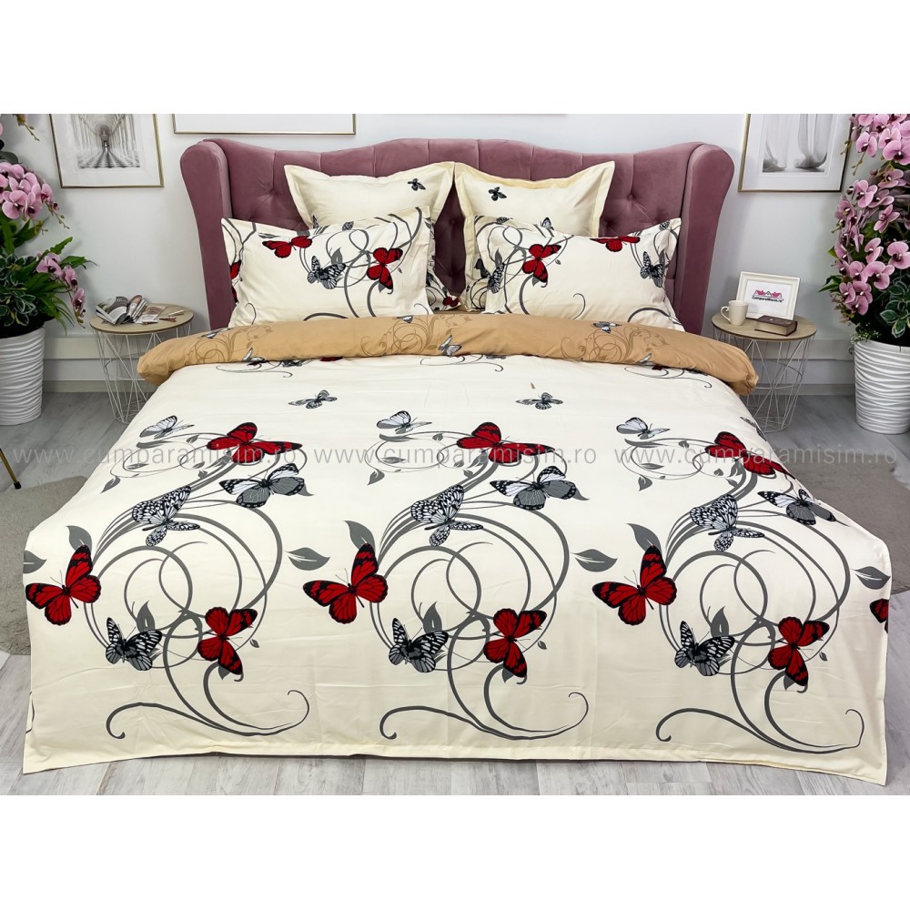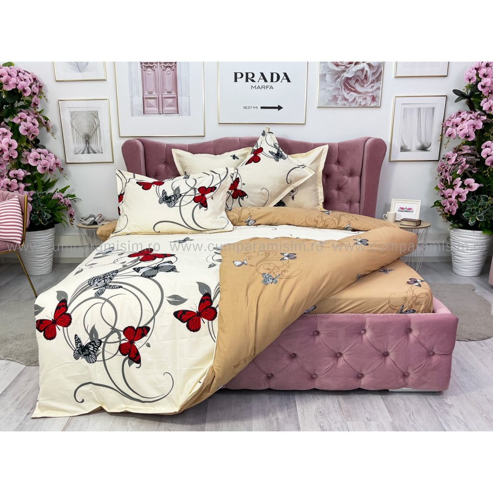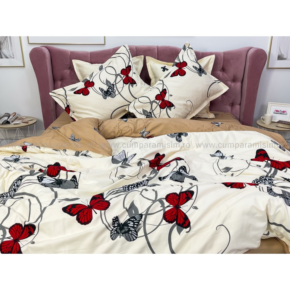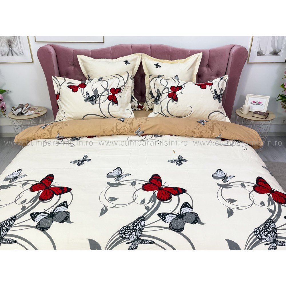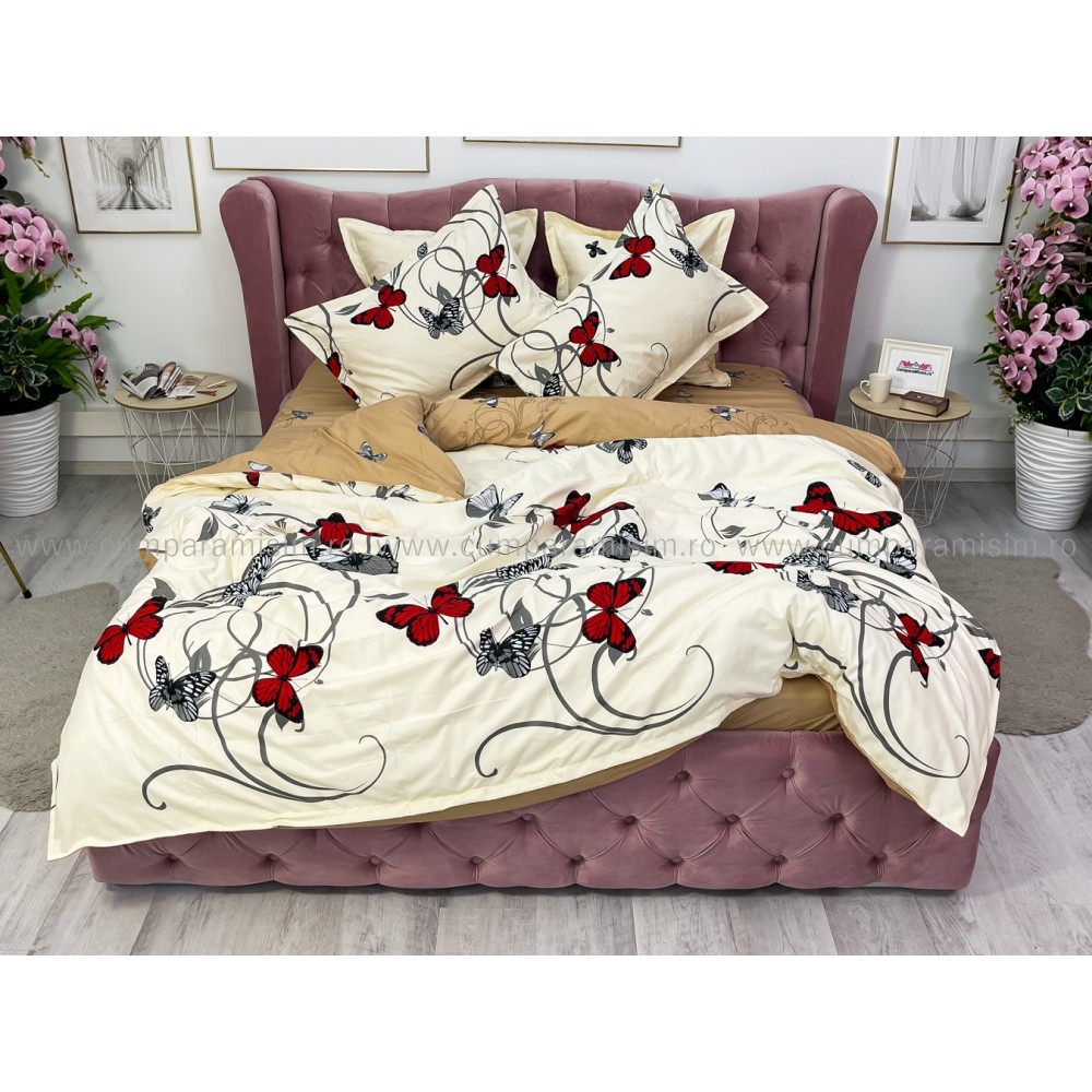 Lenjerie pat dublu, FINET, 6 piese, cu ELASTIC, Jojo Home, Crem-Multicolor, fluturi, cod produs: JOF349