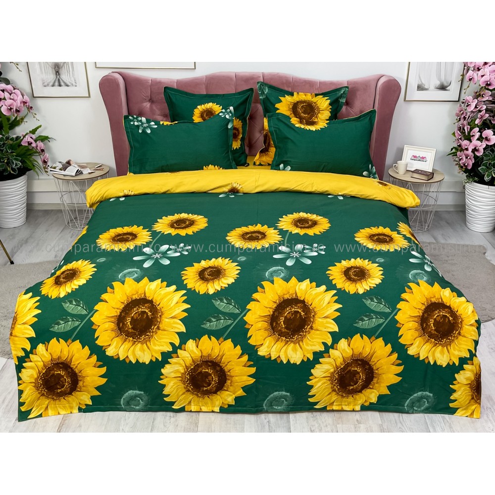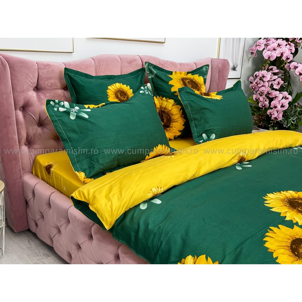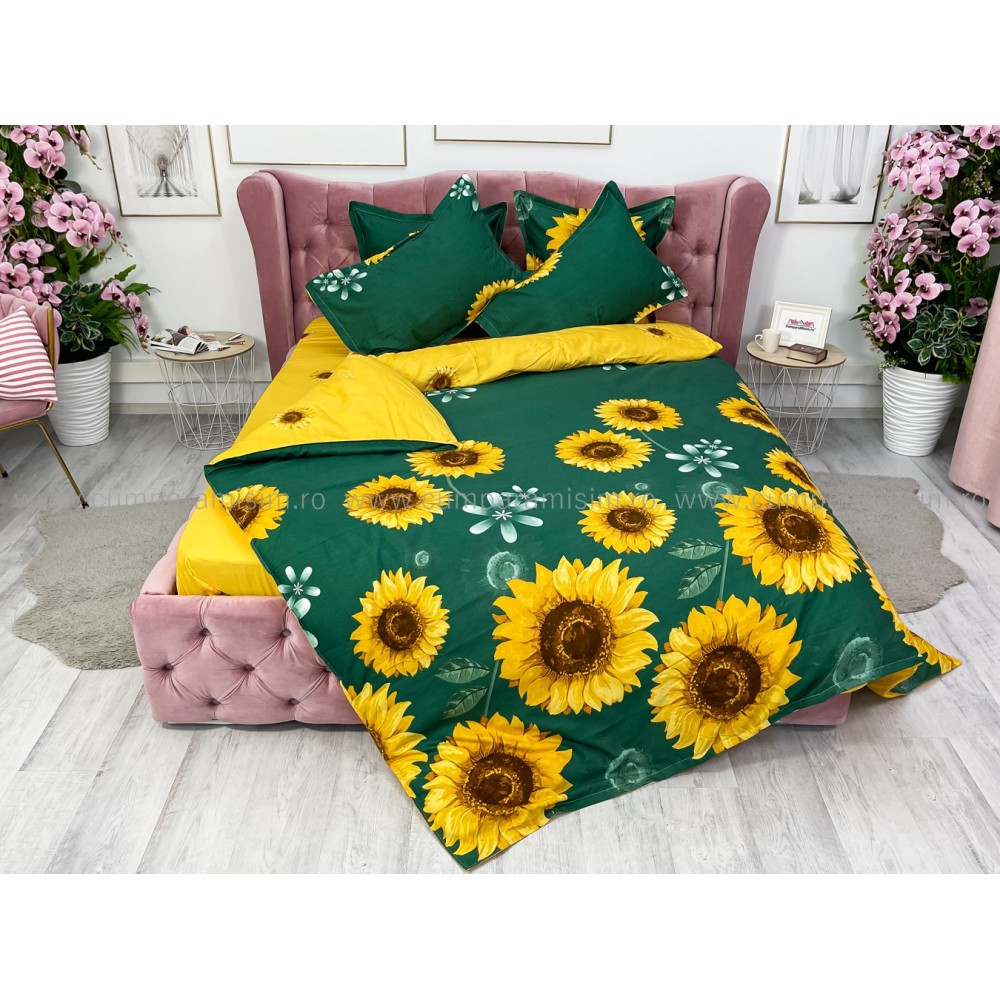 Lenjerie pat dublu, FINET, 6 piese, cu ELASTIC, Jojo Home, Verde-Galben, floarea soarelui, cod produs: JOF312