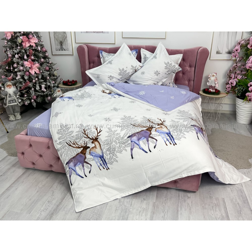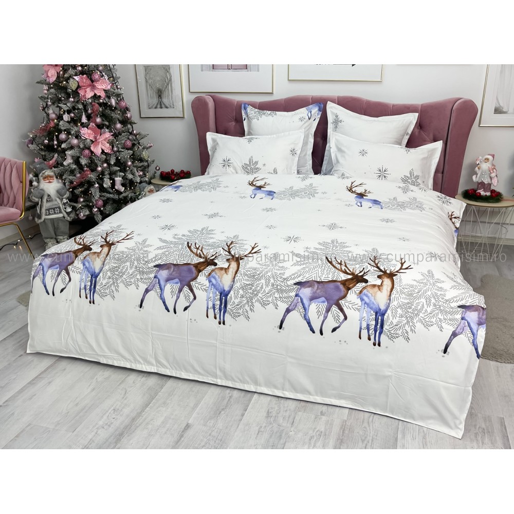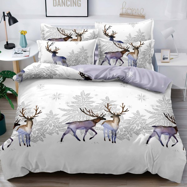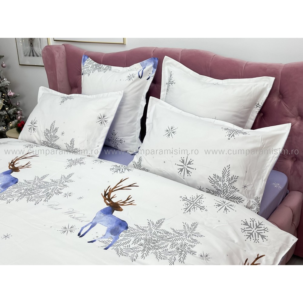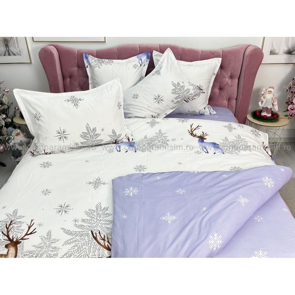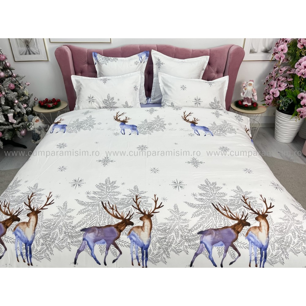Lenjerie pat dublu, FINET, 6 piese, cu ELASTIC, Craciun, Jojo Home, Alb-Gri, reni, cod produs: JOM124