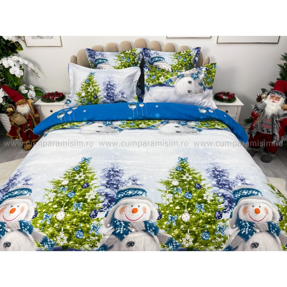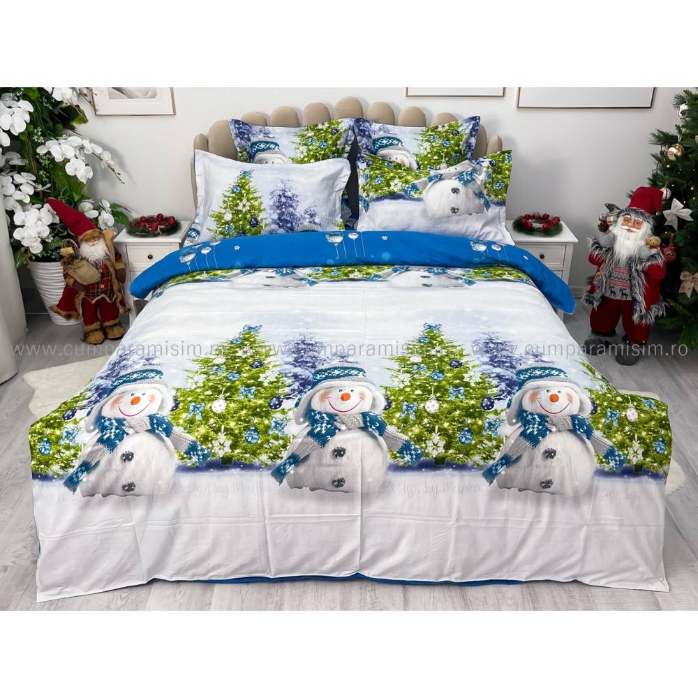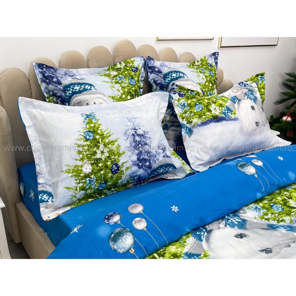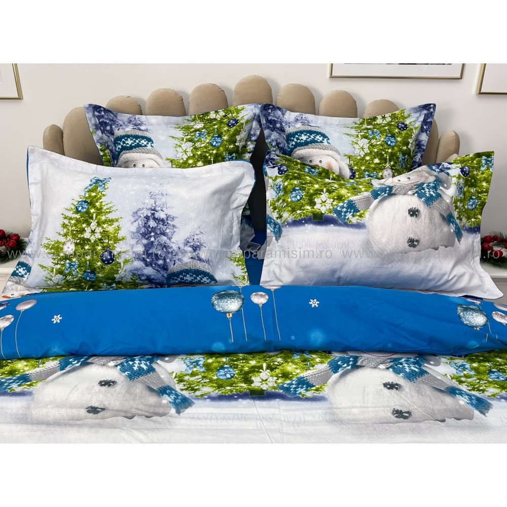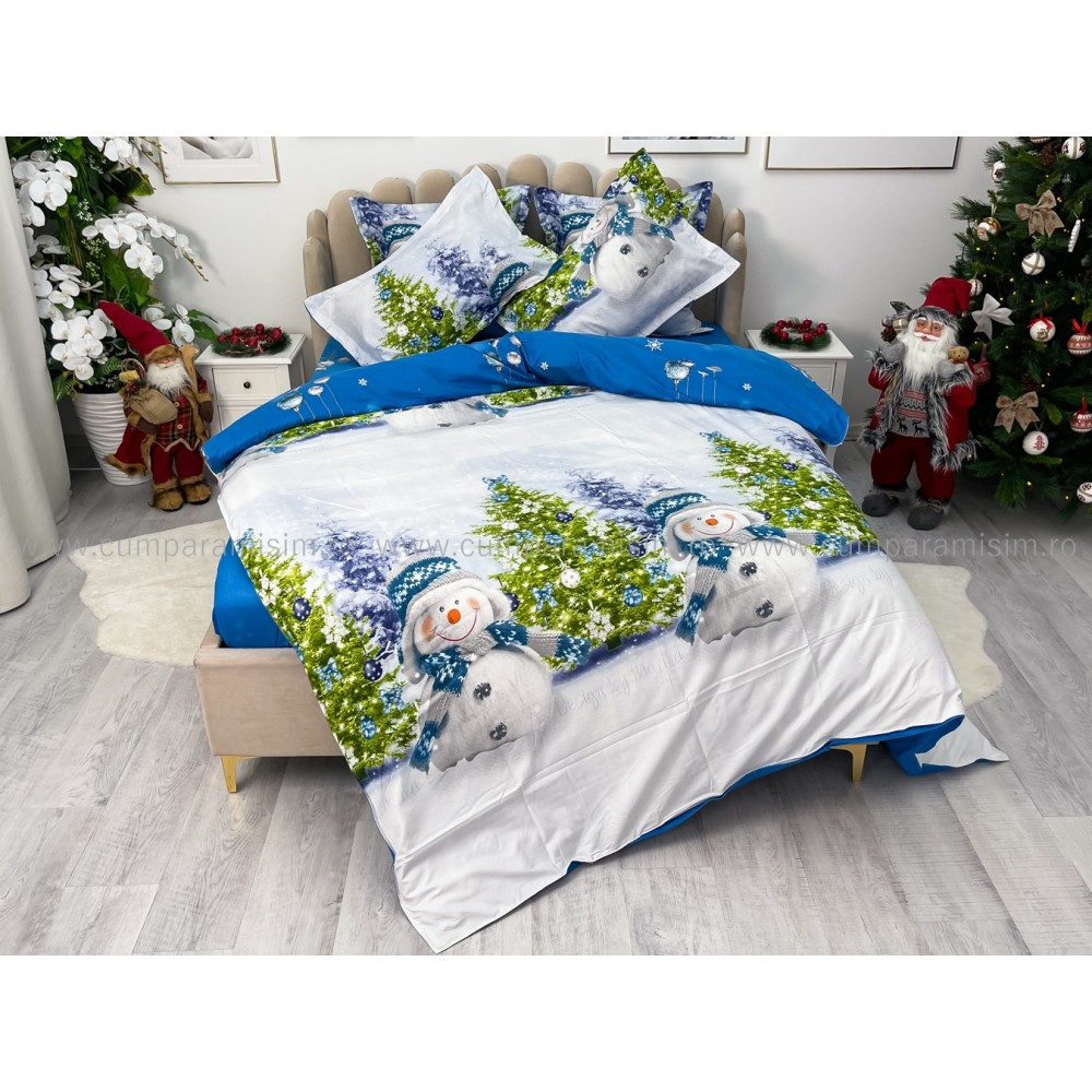 Lenjerie pat dublu, FINET, 6 piese, cu ELASTIC, Craciun, Jojo Home, Alb-Multicolor, oameni de zapada, brazi, cod produs: JOM115