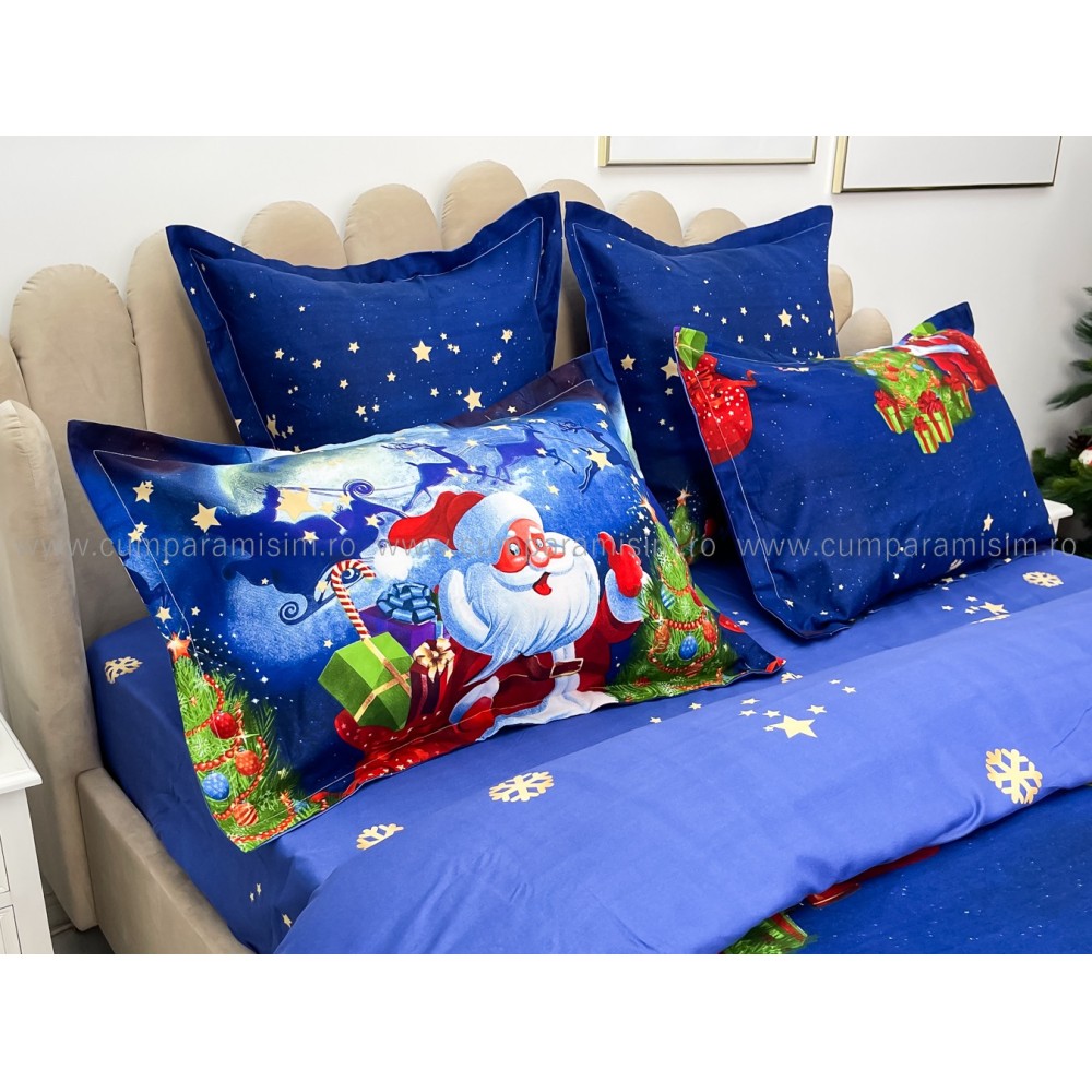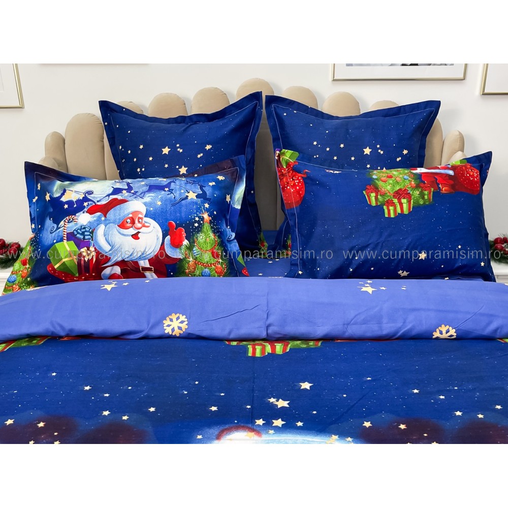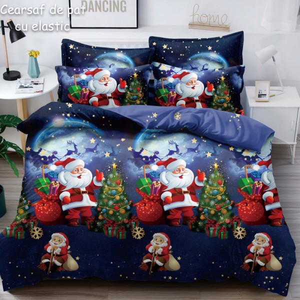 Lenjerie pat dublu, FINET, 6 piese, cu ELASTIC, Craciun, Jojo Home, Bleumarin-Multicolor, Mos Craciun, brazi, jucarii, cod produs: JOM118