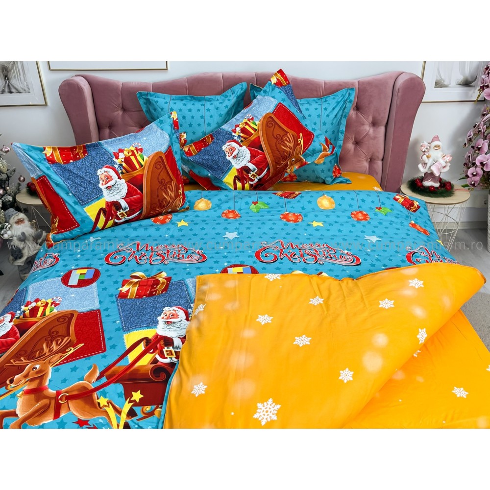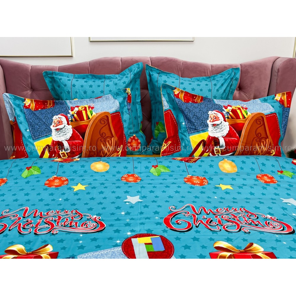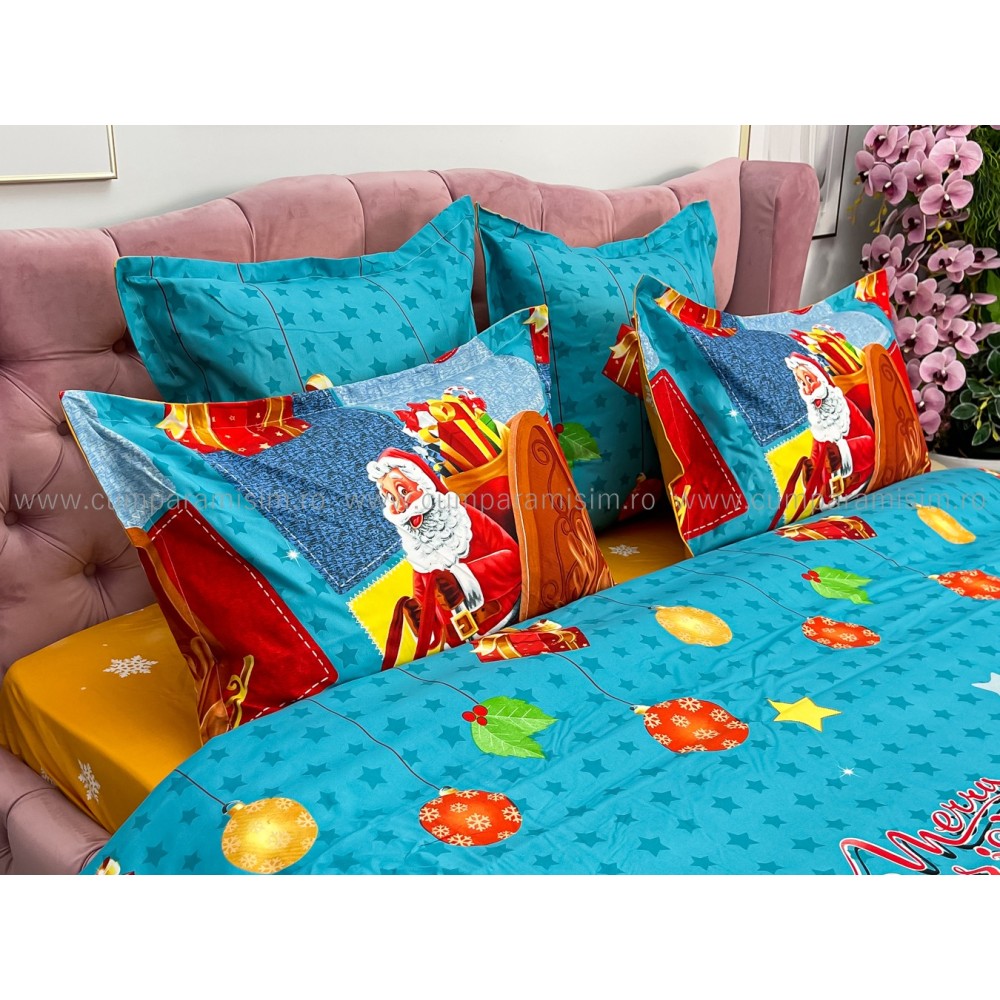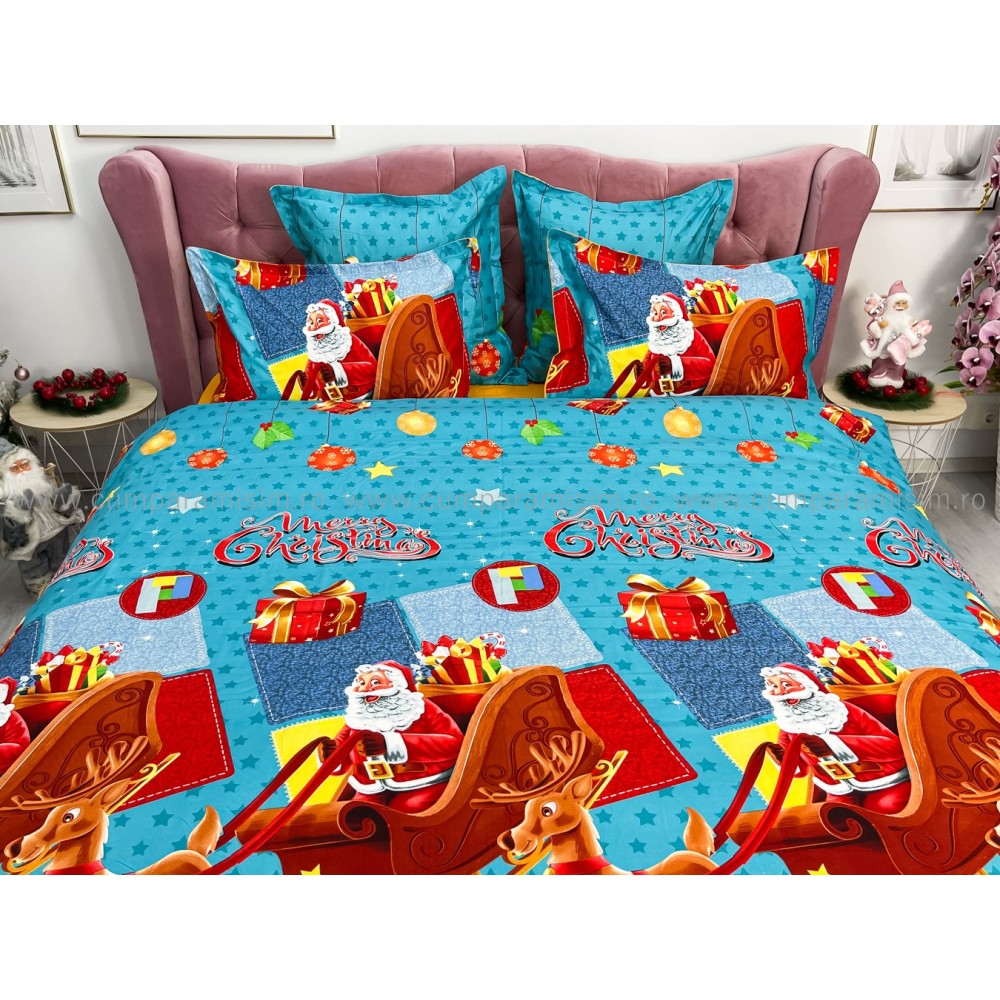 Lenjerie pat dublu, FINET, 6 piese, cu ELASTIC, Craciun, Jojo Home, Bleu-Multicolor, sania lui Mos Craciun, cod produs: JOM108