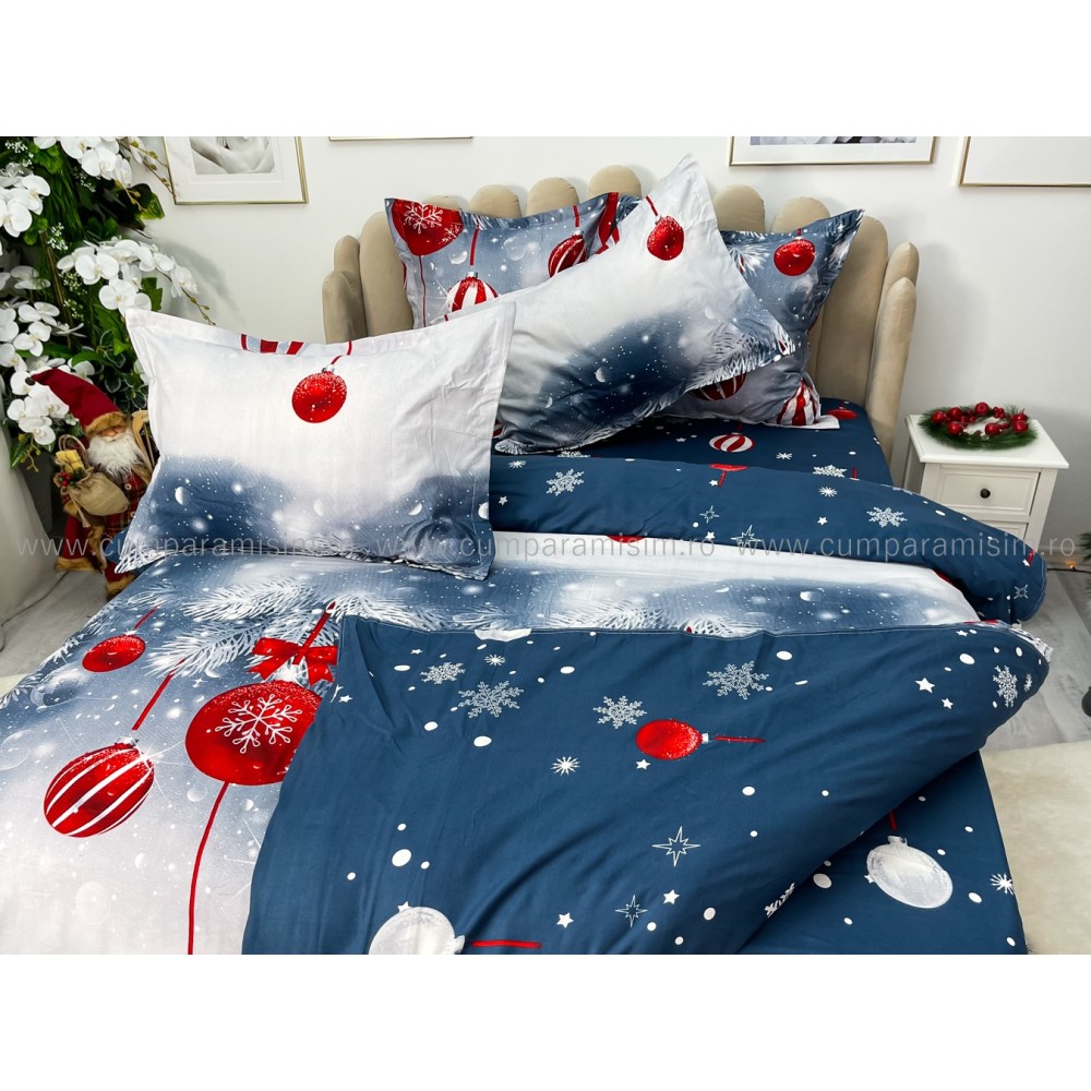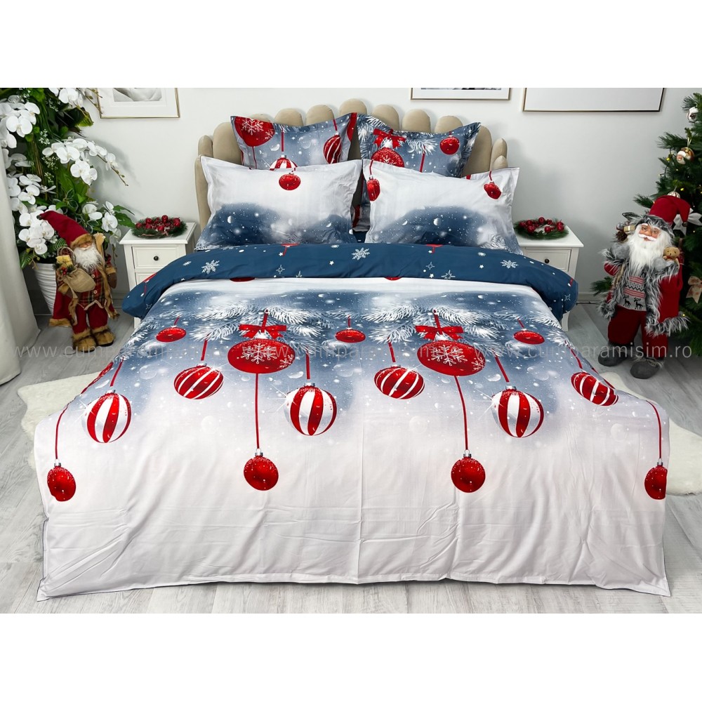 Lenjerie pat dublu, FINET, 6 piese, cu ELASTIC, Craciun, Jojo Home, Gri-Rosu, crengute de brad, globulete, cod produs: JOM110