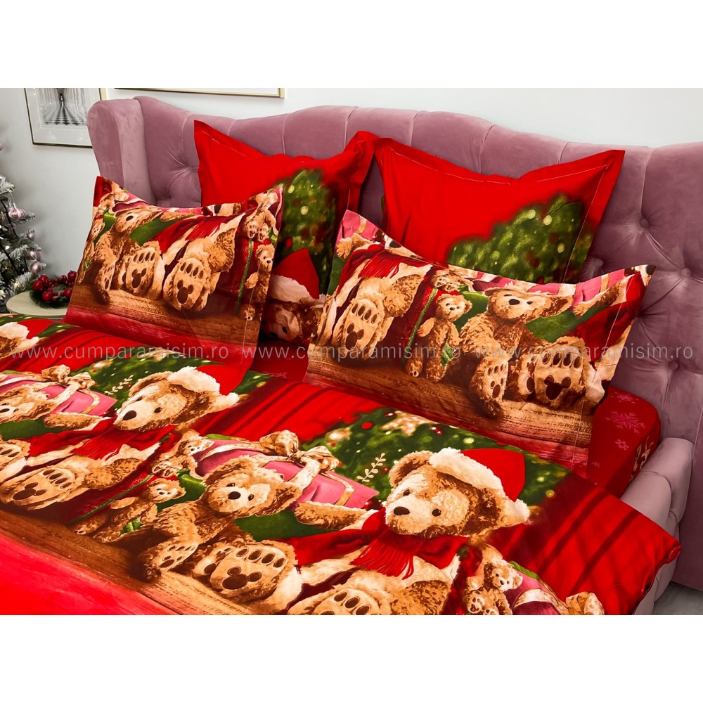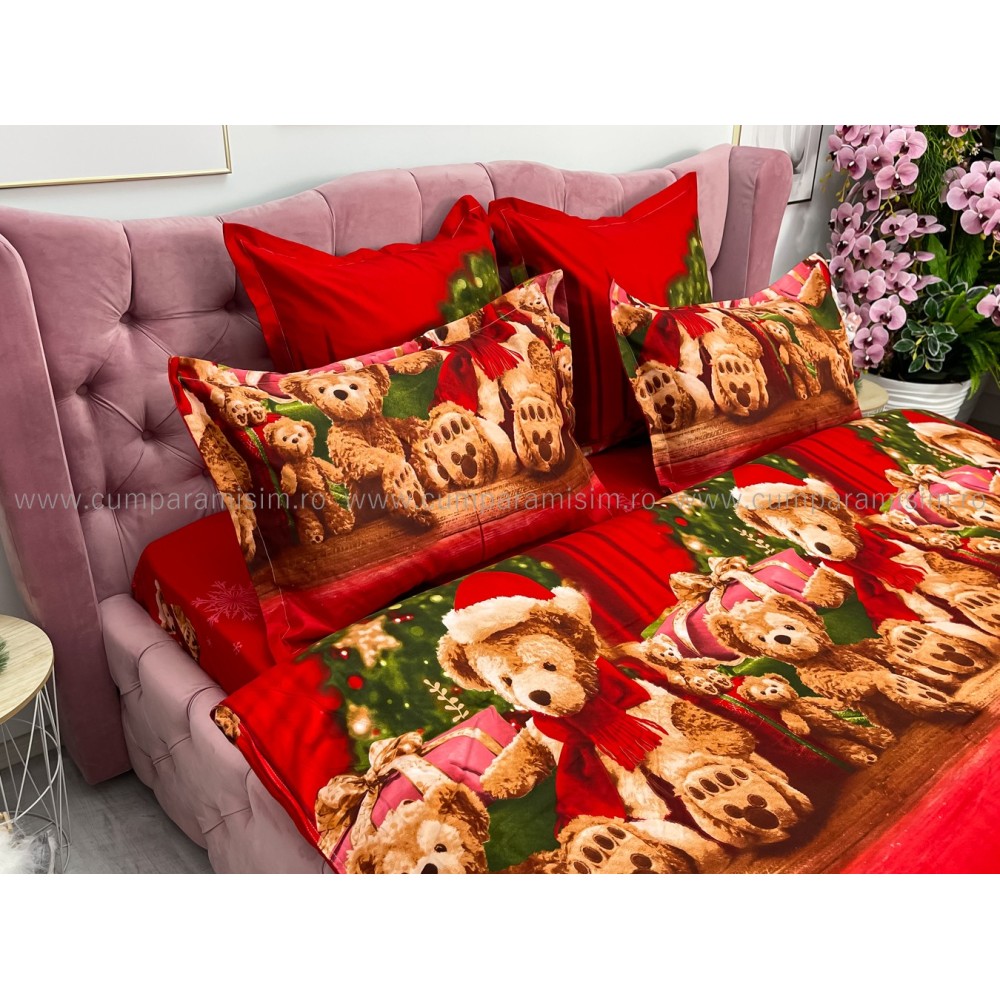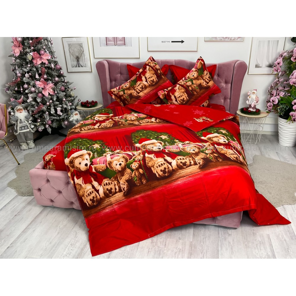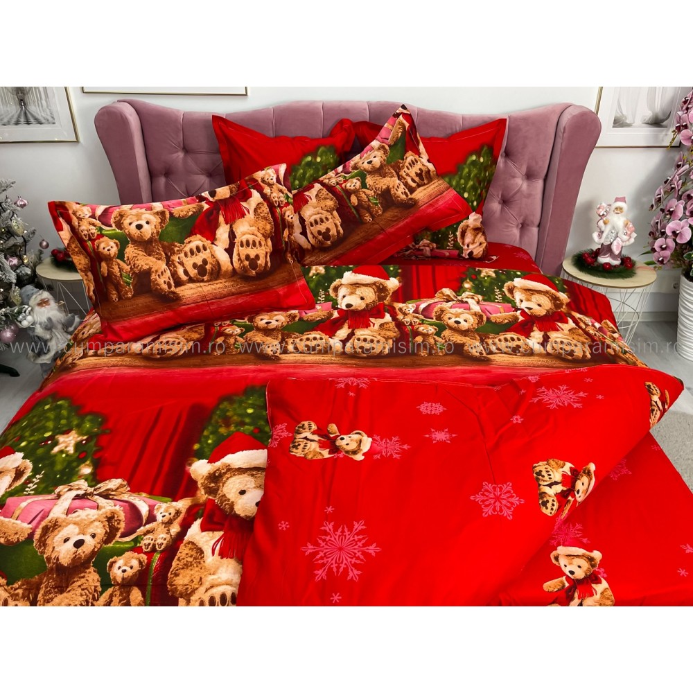 Lenjerie pat dublu, FINET, 6 piese, cu ELASTIC, Craciun, Jojo Home, Rosu-Multicolor, ursuleti, cadouri, cod produs: JOM123